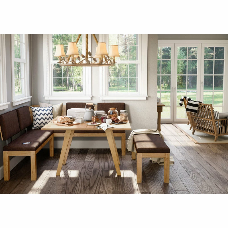 The corner bench, a 45″x 35″ Kitchen Table and an additional bench compose the Austin Breakfast Nook Set. The contained dimensions foster the idea of comfort and intimacy, the play of slim lines lends dynamism while the metal and wood finishes confer a classical identity as well as a contemporary one. All made of Solid Pine Wood from reforestation projects, 100% sustainable. Product Measurements: