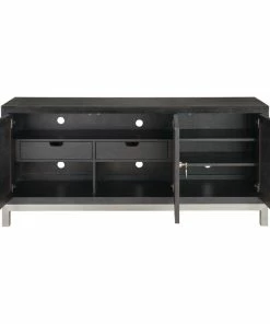 Ash solids and Quartered White Oak veneers. Cerused Mink finish. Three wood-framed doors with inset Stainless Steel border in Silver Mist finish and soft/self closing hinges. Behind paired left/center doors are two compartment, two drawers with hand cut-outs, ventilation holes and four covered grommet holes in back panel. Left drawer has wrapped pad. Right drawer has silverware insert. Behind right door are two adjustable/removable shelves, ventilation holes and one grommet in back panel. Tubular Stainless Steel base in Silver Mist finish. Adjustable glides. Note: For safety, an anti-tipping kit is included with instruction sheet.