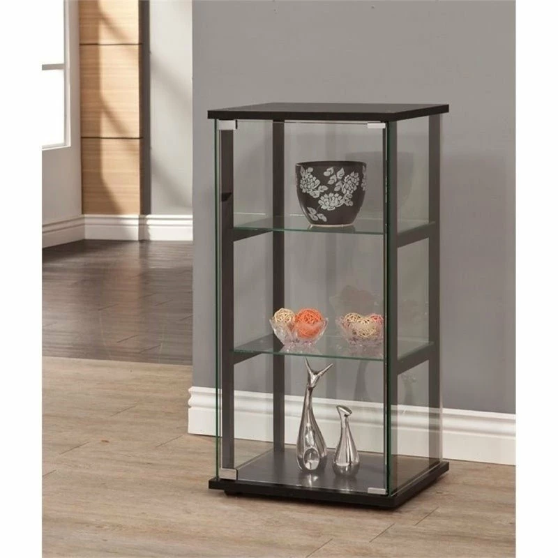 A modern version of a true classic makes a fabulous addition to a transitional space. With linear styling and a fresh look, this wood curio cabinet offers a perfect venue for showcasing treasured dΓ©cor. Bold black tops a simple frame, top, and base. Tempered glass shelves create transparent space for display. Access its interior easily with push-to-open doors.