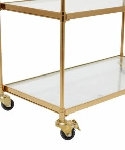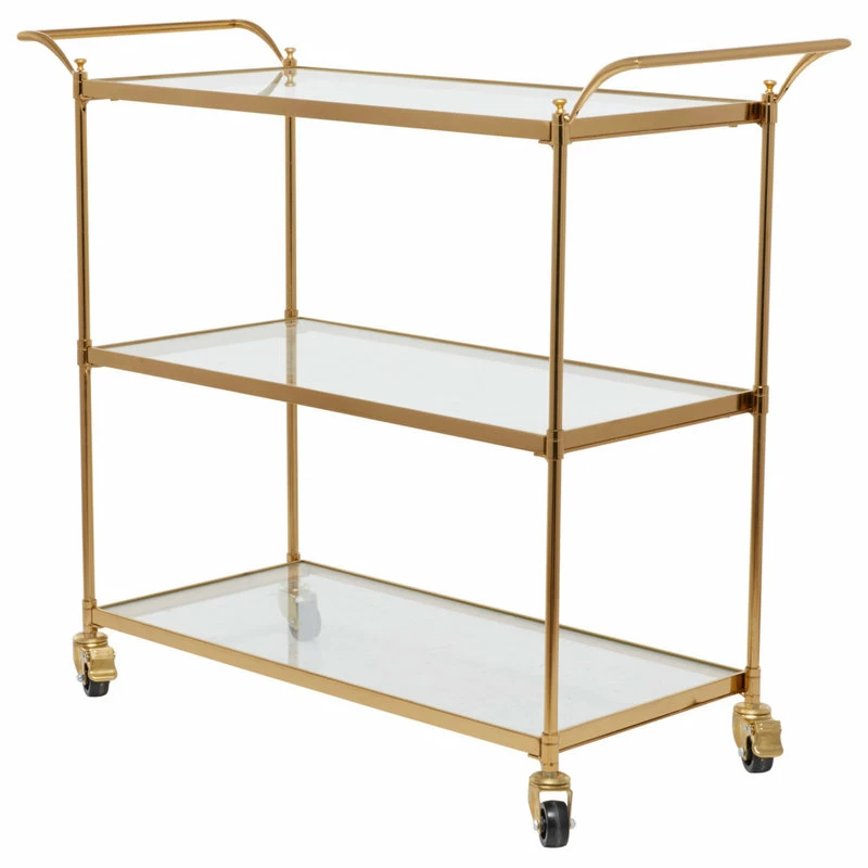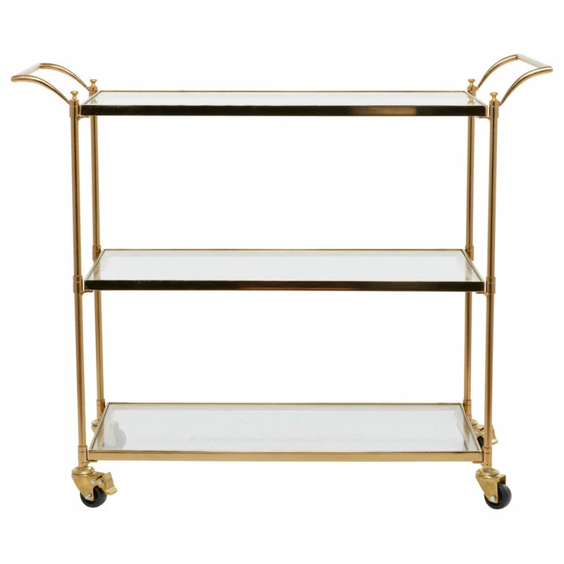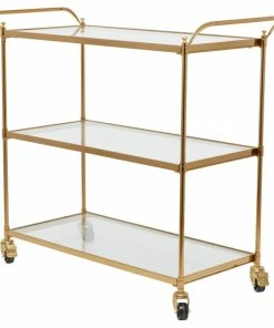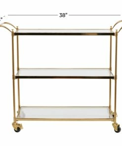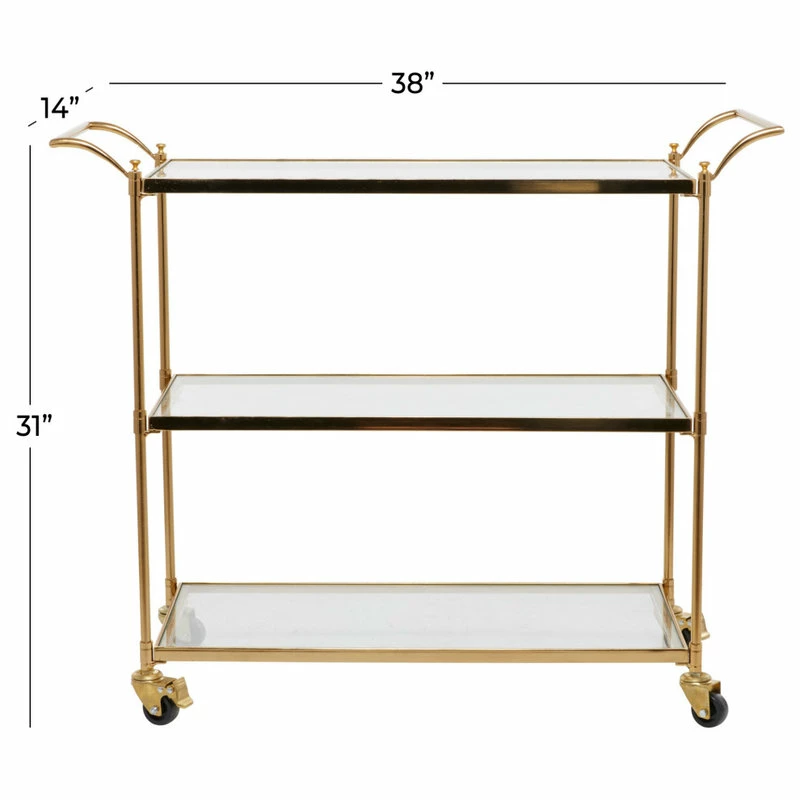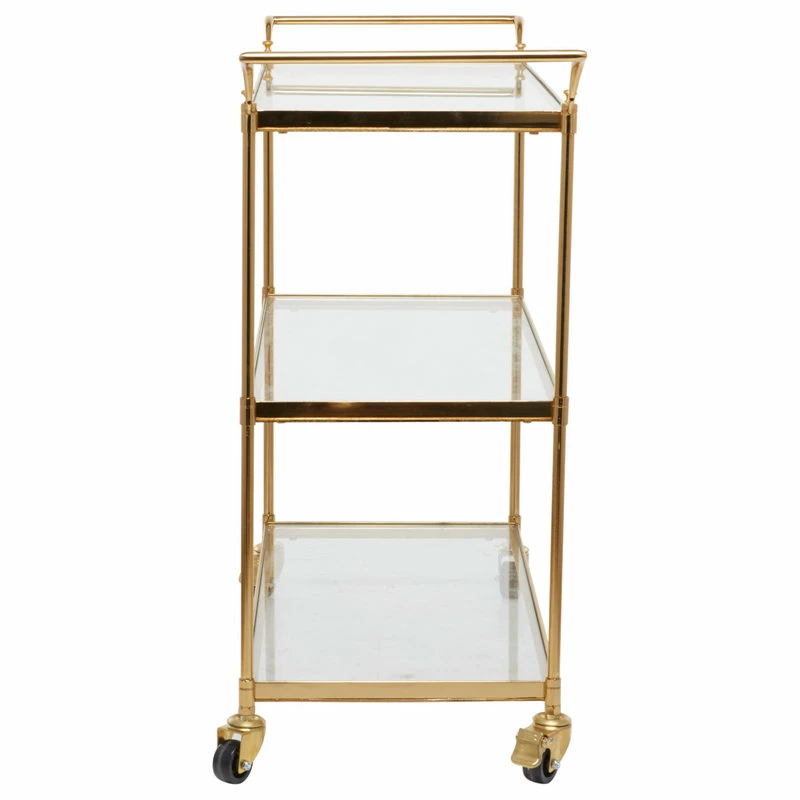 Looks stylish in your living room or kitchen as a serving tray or as a decor stand. An optimal mobility piece of furniture that will show to wow your guests for any occasion. Gold storage cart is a refined and stunning statement piece that gives a luxurious display in any space. This item ships in 1 carton. Suitable for indoor use only. Some assembly required. Maximum weight limit is 30 lbs. This is a single bar cart. Iron bar cart features 3 shelves. Traditional style.