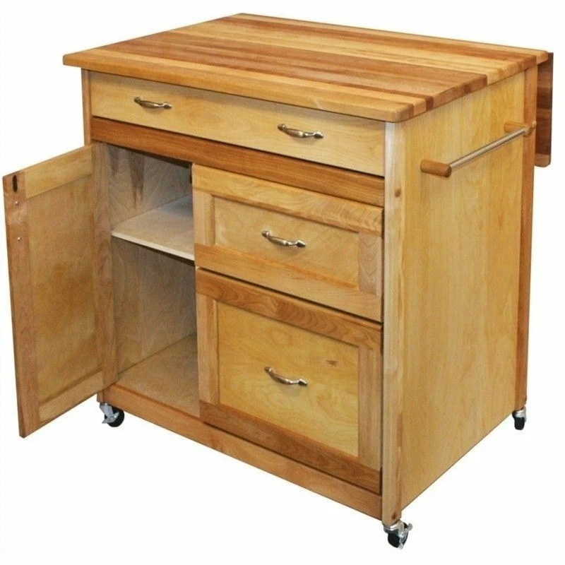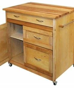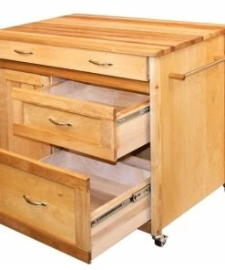 The Deep Drawer Island features butcher block construction with large drawers and cabinet storage.