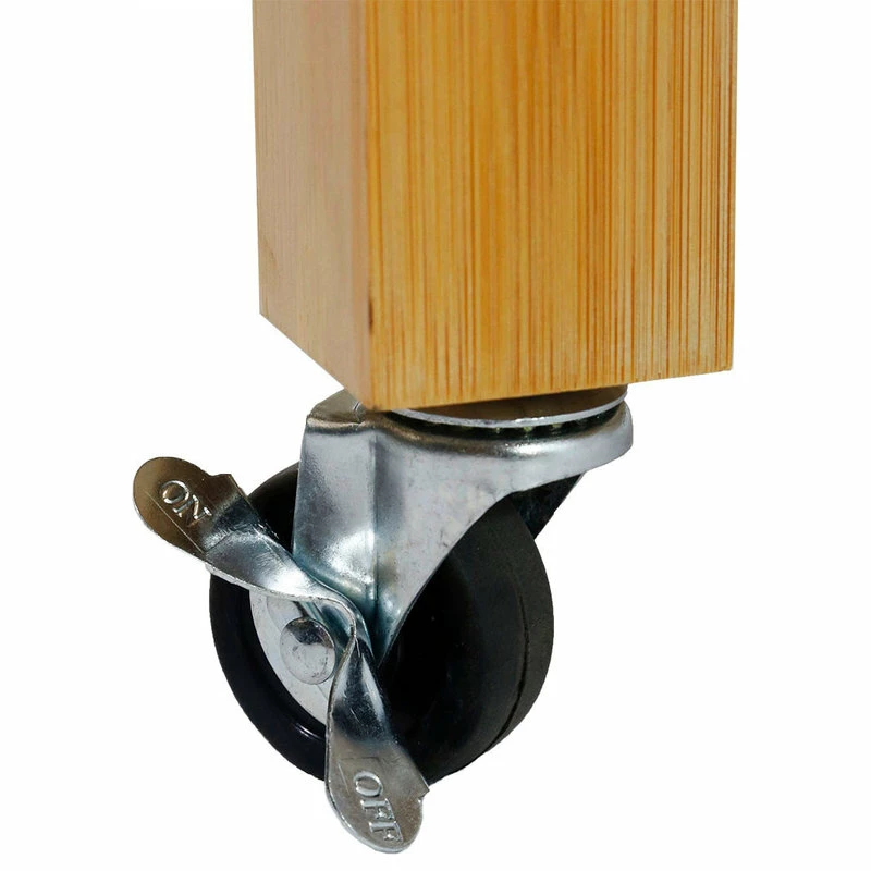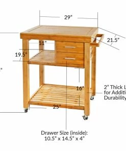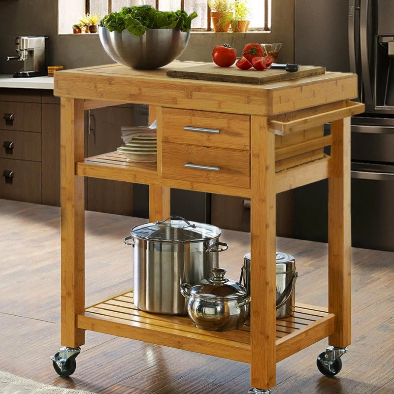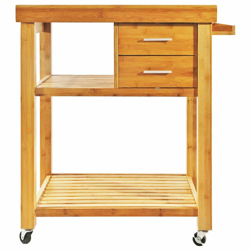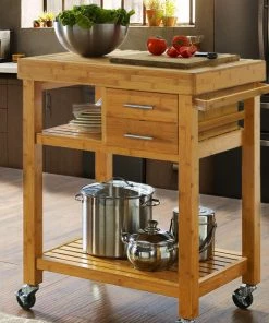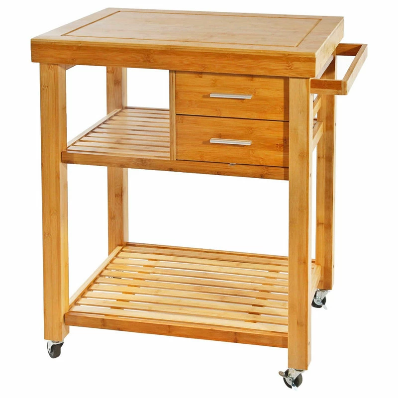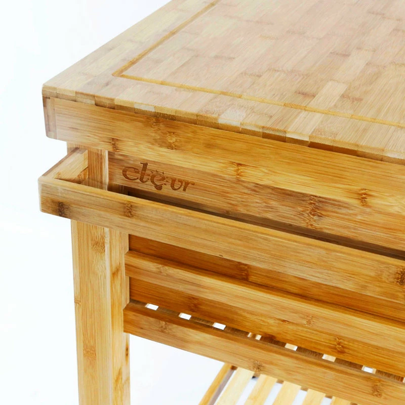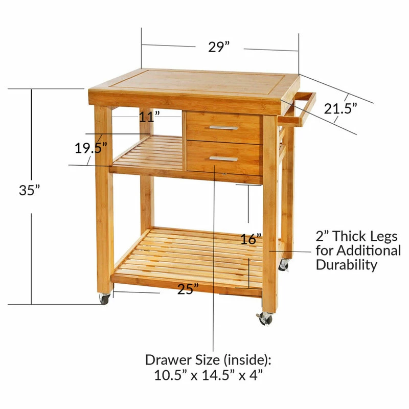 Clevr Rolling Bamboo Cart. Made out of high quality, sustainably sourced, kiln-dried and varnished bamboo. Suitable for all your kitchen needs, this cart is perfect for food prepping or serving. It features a convenient drawers for the most commonly used utensils at hand and added kitchen storage. Equipped with extra shelf space perfect wine, olive oil, towels, spices, or any handy kitchen accessories. The cart also contains convenient rack for hand towels and aprons. The cart also features four non-marring casters, two with locks.