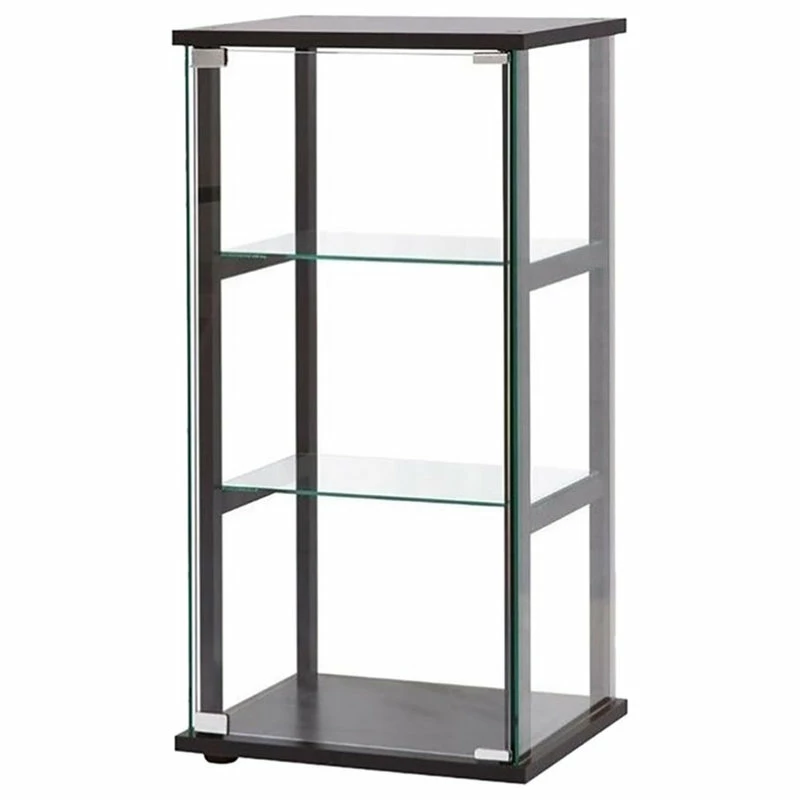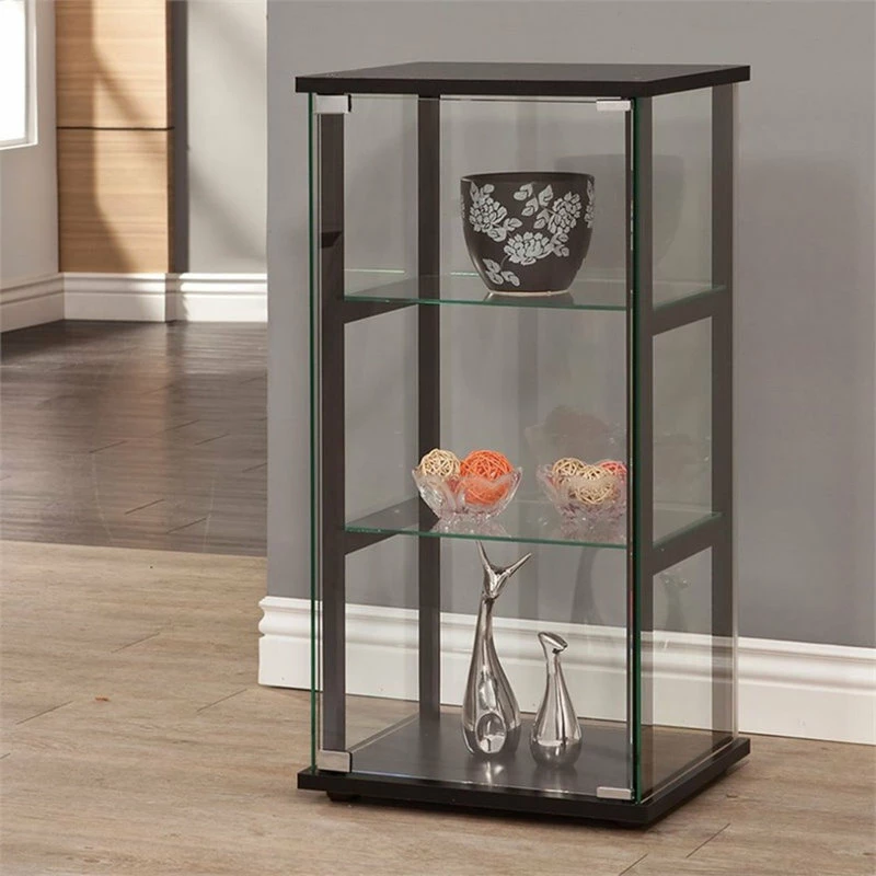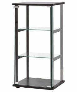 A modern version of a true classic makes a fabulous addition to a transitional space. With linear styling and a fresh look, this curio cabinet offers a perfect venue for showcasing treasured dΓ©cor. Bold black tops a simple frame, top, and base. Tempered glass shelves create transparent space for display. Access its interior easily with push-to-open doors.