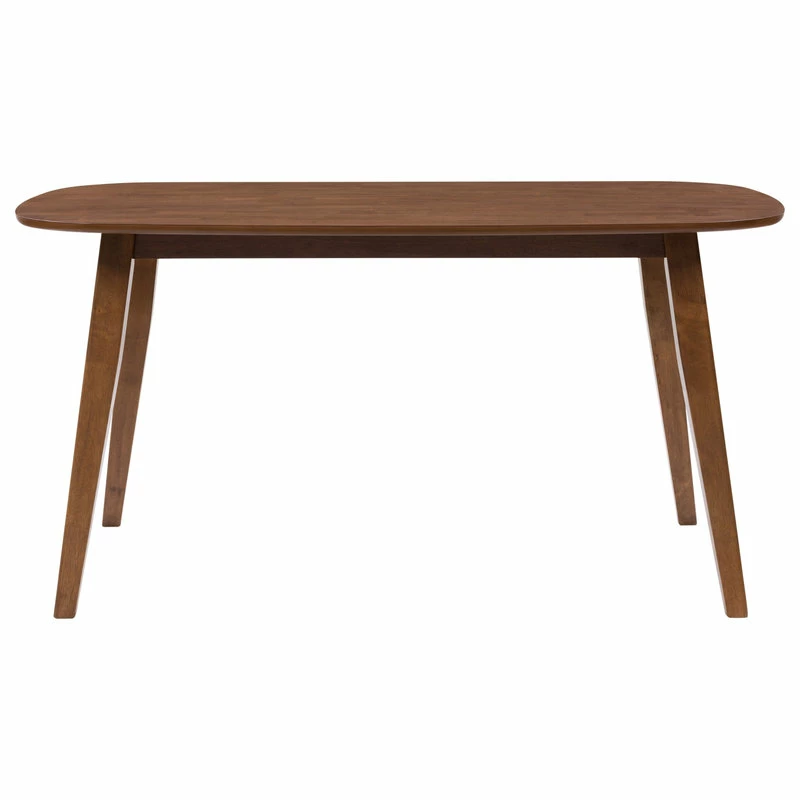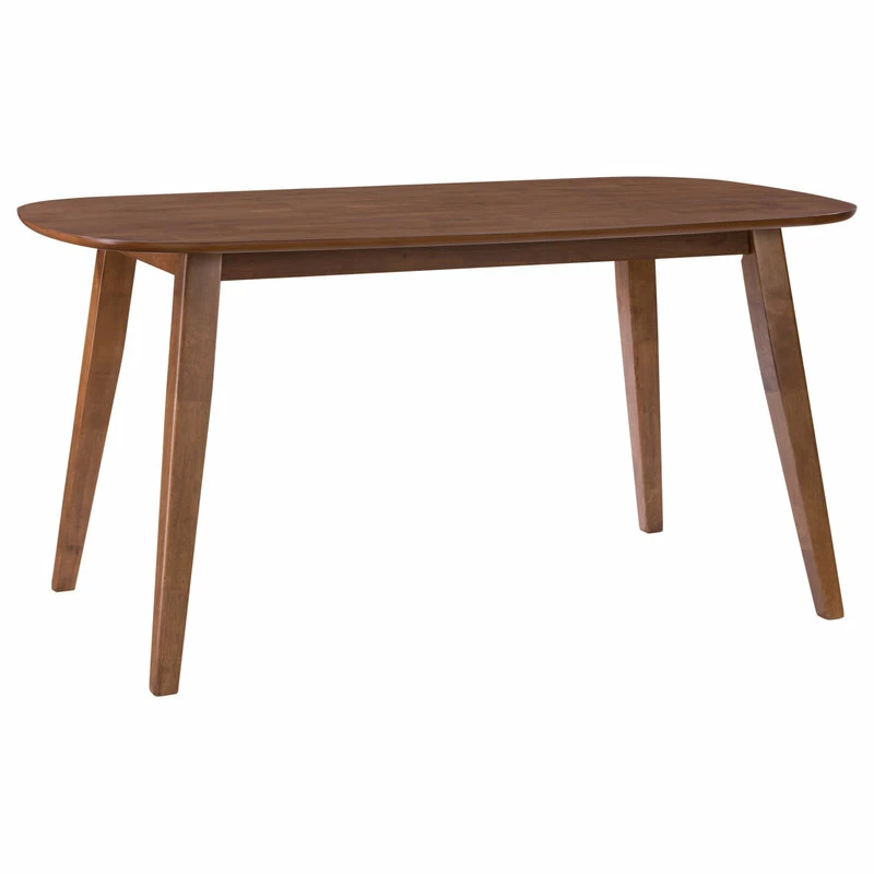 Anchor your dining space with this stylish mid-century modern dining table with sleek beveled edges and perfectly cut rounded corners. The top is finished with a real wood grain veneer offering a modern flair with its look and feel. Supported by legs made from solid wood, this table was built for style and durability!