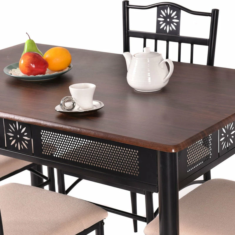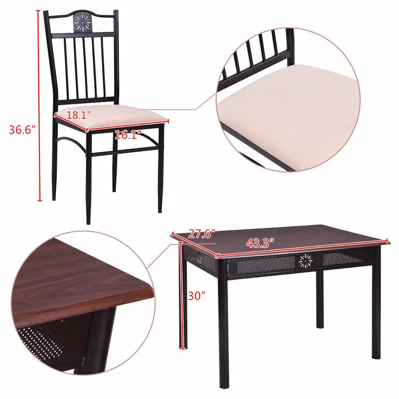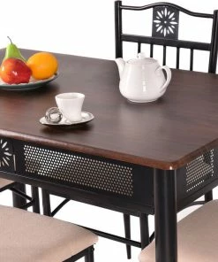 Update the look of your dining area with the Mainstays 5-Piece Wood and Metal Dining Set. This elegant piece has a sturdy steel table frame and a Purple Wooden-Texture Surface with four metal chairs that have upholstered seats. The upholstered seat has some cushioning, so it is comfortable to sit in whether you are just having a quick meal or relaxing with guests after a nice dinner. Use it in your dining room to add a contemporary look or use it in the kitchen for a more casual feel.
