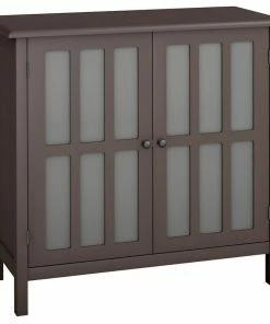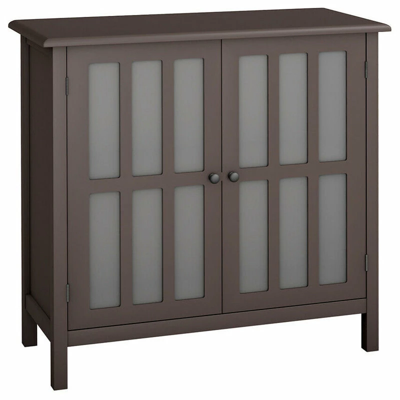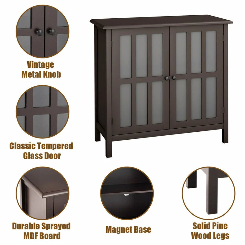 - Functional storage cabinet has 2 tempered glass doors that open to two shelves for versatile storage