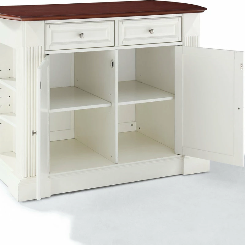 Constructed of solid hardwood and wood veneers, this kitchen island is designed for longevity. The handsome raised panel doors and drawer fronts provide the ultimate in style to dress up any culinary space. Raise the drop leaf to expand your serving space, or just sit at the breakfast bar and eat your meal. Behind the doors, you will find adjustable shelves and an abundance of storage space for objects you d prefer to keep hidden. Open storage on both ends provides easy access to frequently used items, and is perfect for displaying decorative objects. Raised diamond accents and fluted pilasters are sure to impress your guests. Style, function, and quality make this kitchen island a wise addition to your home.