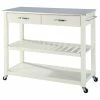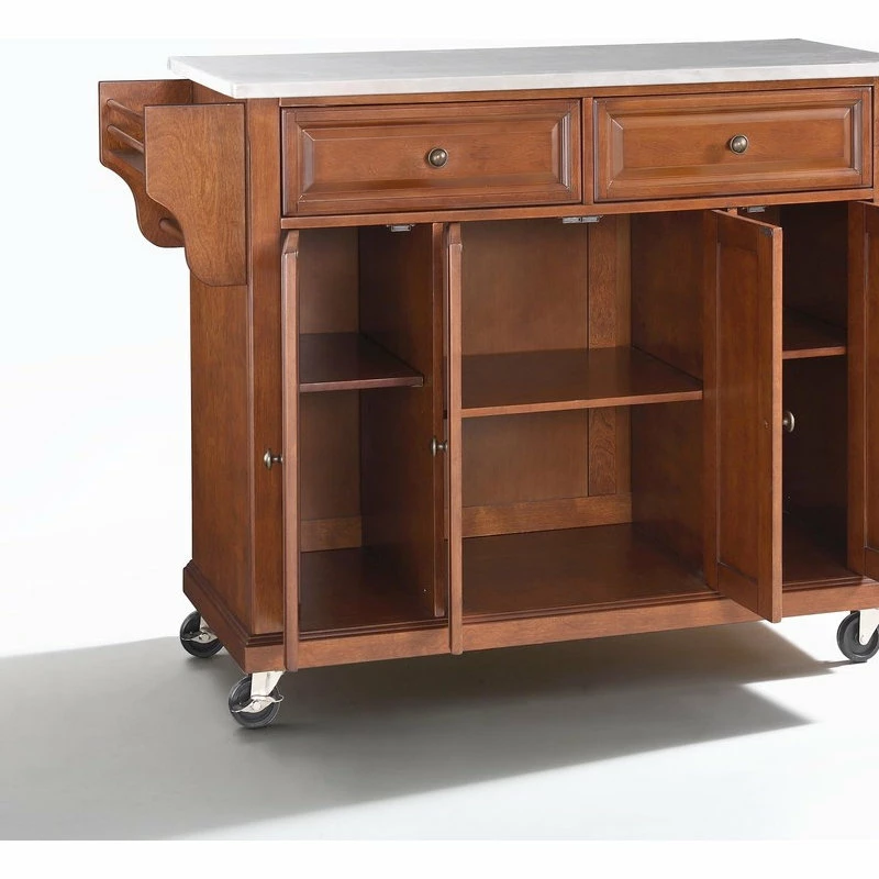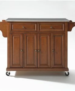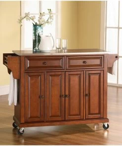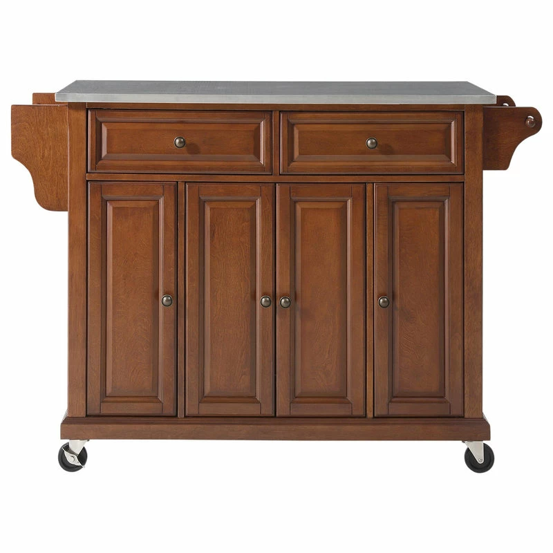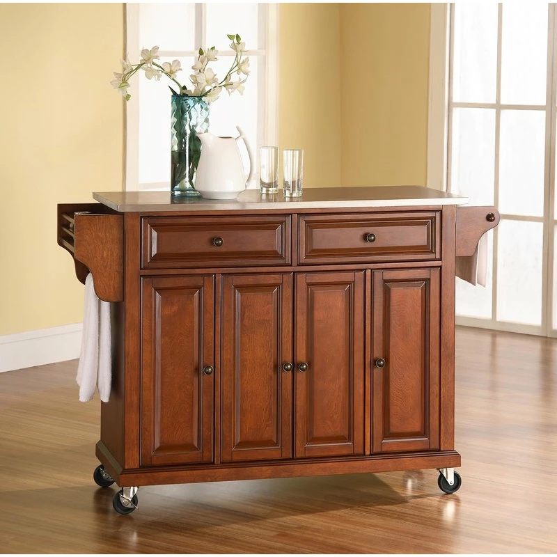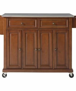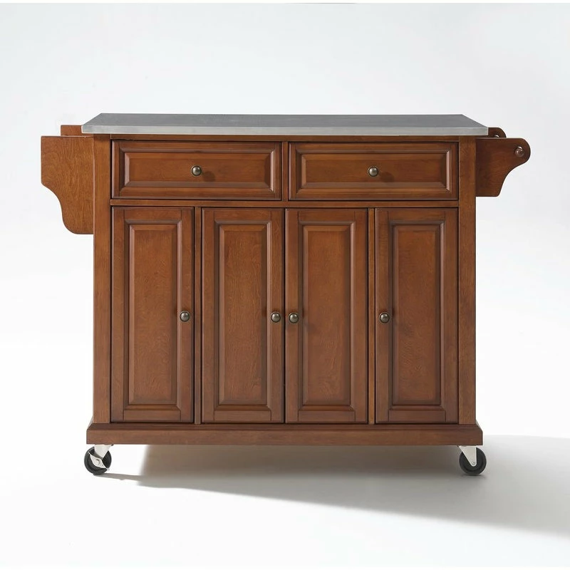 Crafted from solid hardwood, this mobile kitchen island from Crosley offers a classic cherry finish and raised panel door and drawer fronts for a traditional look. Fitted with adjustable shelves and an abundance of storage space, this product is also equipped with lockable casters for optimal mobility, a stainless steel top, and a spice rack with towel bar. With its crisp lines and sleek silhouette, Crosley’s Kitchen Island exudes a “quiet elegance” that blends seamlessly with a range of transitional decor styles.