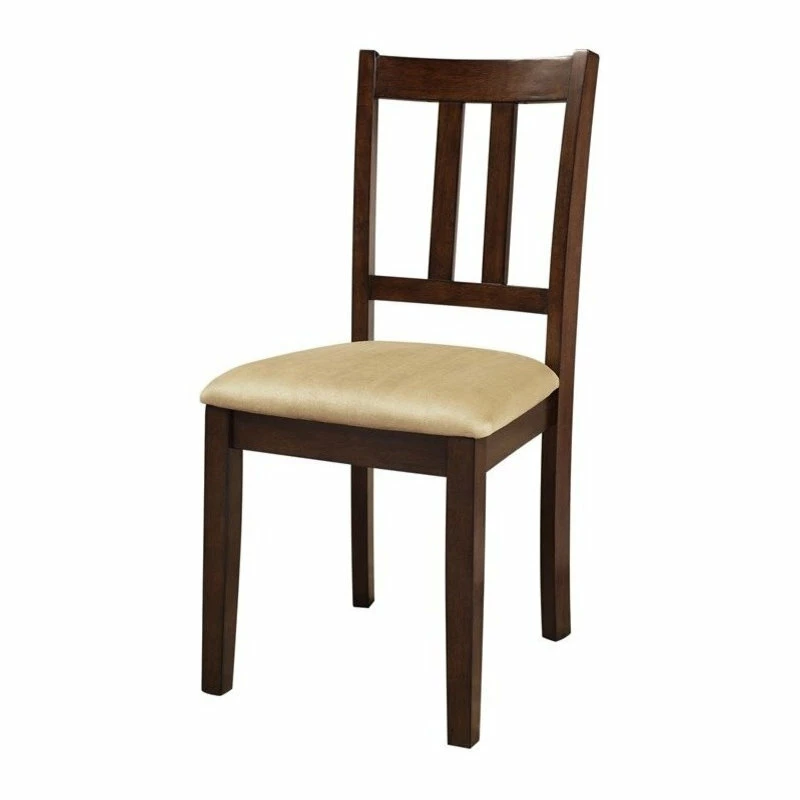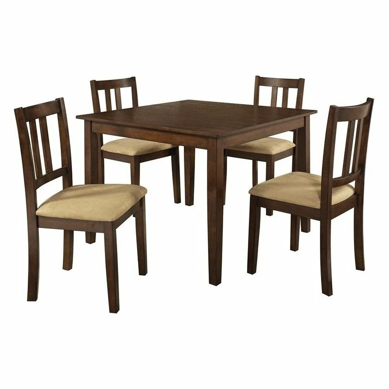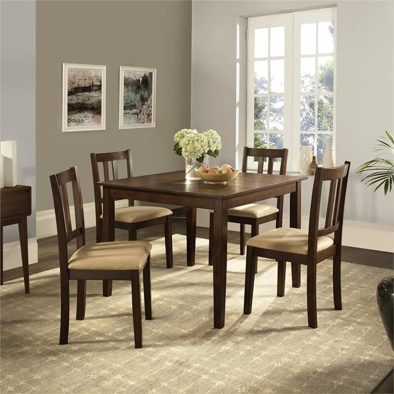 The Dorel Living Redmond 5-Piece Traditional Height Dining Set will effortlessly add a touch of warmth and elegance to your dining room or kitchen setting. This set features beautiful details such as the table top’s wood panel look, tapered legs, and wood grain finish. The chairs are made of solid wood and are finished in the same espresso tones as the table. The chair upholstery is an easy care and durable beige microfiber fabric that complements the entire set. Enjoy gatherings and family dinners around the Dorel Living Redmond Traditional Height Dining Set for years to come.