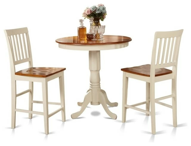 This unique circular counter height sets will grace any kitchen space. Circular gathering table and bar stools are superb for kitchen use since this sets are efficient.Two tone kitchen table with brown table top and Linen White legs. Splendid circular counter height dining table should fit perfectly in all home, dining room. Tough wood seats kitchen bar stool are generally suitable for house usage..Vertical back style counter height stool would certainly make impression on your guess featuring its sophisticated yet contemporary style. Table Dimensions: Length 36; Width 36; Height 36, Chair Dimensions: Length 18.5; Width 17; Height 42