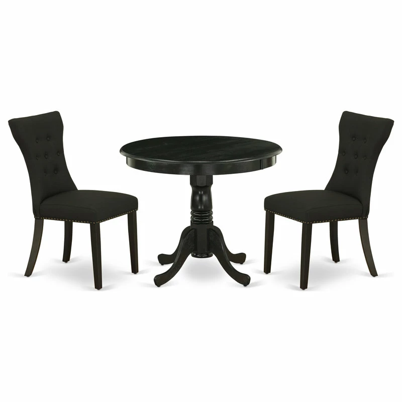 East West Furniture 3-Piece kitchen dinette set including 2 padded parson chair and a pedestal luxurious dining table will increase the beauty of your dining room or kitchen areas. This dinette set is made from durable Asian wood, known as Rubber Wood, which is rugged enough to withstand years of use. It also has an ergonomic design, which is very comfortable. Single wood kitchen table with 2 upholstered dining chairs is in Wirebrushed Black finish. This dinette set would add charm and attractiveness to your kitchen or dining room. This breakfast table is flexible and cozy. This modern dining table features a compact design ideal for small areas. The parson dining chair seat is made of soft Linen Fabric cushion, with Solid Rubber wood legs and stylish soft Linen Fabric backrest with Asian wood structure, soft cushion, and stylish button tufted backrest design to make you more comfortable. Our round dinette set adds some modern beauty to your home. Parson chair and a modern dining table give lots of space for your family or friends. The simplistic and beautiful design is accentuated by a glossy Wirebrushed Black finish. You will certainly enjoy this stunning wooden dining table set. It’s Quick put together the modern dining chairs and wood dining table with a simple tool. No additional tools are required. Easy-to-follow guidelines, tools, and hardware are included.