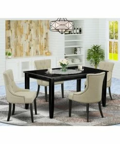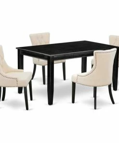 Furnish your dining area with this excellent classy DUFR5-BLK-2 dinette set includes a rectangular dining table and four parson chairs. The traditional style and design of this dinette set corresponds all sorts of dining decor concepts and assures that meals are always filled with joy. The center rectangular table is best for 4-6 people to sit and enjoy their meal. The kitchen table along with straight legs is created from high quality rubber wood known as Asian Hardwood. No heat treated pressured wood like MDF, particle board or veneer top fabricated. A regal and affordable Parson chair offers a touch of beauty to any dining room and provides a sensible seating arrangements. The upholstered dining chair features a beautiful stitched exterior. Tall back, Linen Fabric, high-density foam padding, solid hardwood frame construction, comfortable, durable and attractive. Whether you use this kitchen chair is an easy to assemble and stylish answer to your seating needs. The standard shape, size and design makes the dining area significantly attractive. This contemporary, budget friendly, durable and comfortable dinette set can be good choice if you are looking for a great dining time experience with your family or friends.