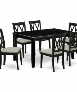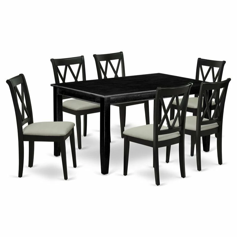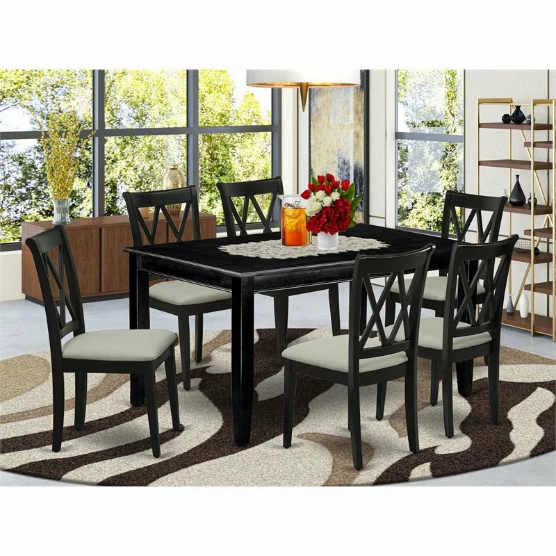 Furnish your dining area with this excellent classy DUCL7-BLK-C dinette set includes a rectangular dining table and six kitchen chairs. The traditional style and design of this dinette set corresponds all sorts of dining decor concepts and assures that meals are always filled with joy. The center rectangular table is best for 4-6 people to sit and enjoy their meal. The kitchen table along with straight legs is created from high quality rubber wood known as Asian Hardwood. No heat treated pressured wood like MDF, particle board or veneer top fabricated. Slender Double X back dining chairs present fashionable and cozy seating, with Linen seats finished in elegant black which let you enjoy a nice and trendy dining experience. The frame of the kitchen chairs are engineered to offer a great amount of comfort to your spine and thus reduce the chances of back pain. The standard shape, size and design makes the dining area significantly attractive. This contemporary, budget friendly, durable and comfortable dinette set can be good choice if you are looking for a great dining time experience with your family or friends.