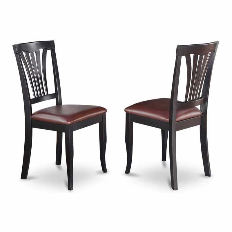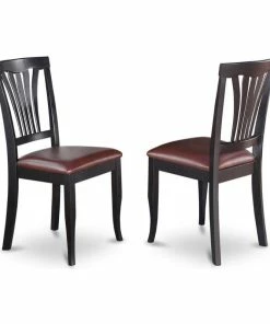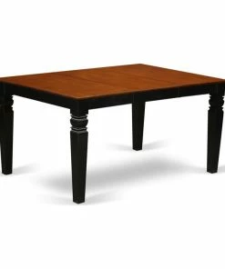 Coordinating black and cherry color solid wood dinette set having basic beveled edge on trim. Classic rectangle kitchen dinette table with 4 legs. Recessed details on dining room table and dining chair legs for added support and beauty. Beveled carving on legs of harmonizing table and chairs. Dining room table that includes 18 in self storage extendable leaf in dining room center suited to casual or formal atmosphere. 7 pc dining set with 1 Weston kitchen table and six faux leather upholstery dining room chairs finished in an elegant black and cherry color.