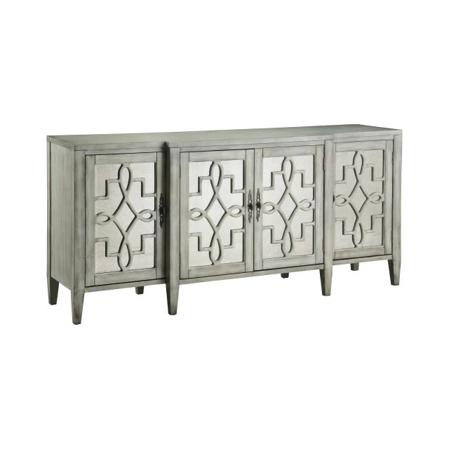 Breakfront mirrored four door credenza features antique mirror glass set behind intricate open scroll fretwork, fixed interior shelves and square tapered legs. Available in your choice of Black, Blue Gray, Turquoise, or Gray finishes.