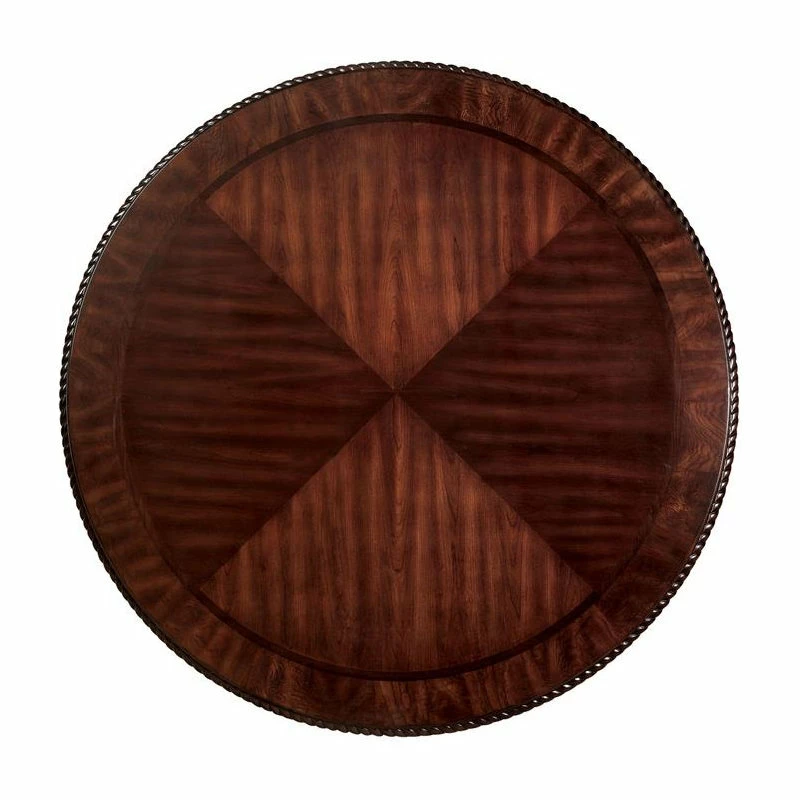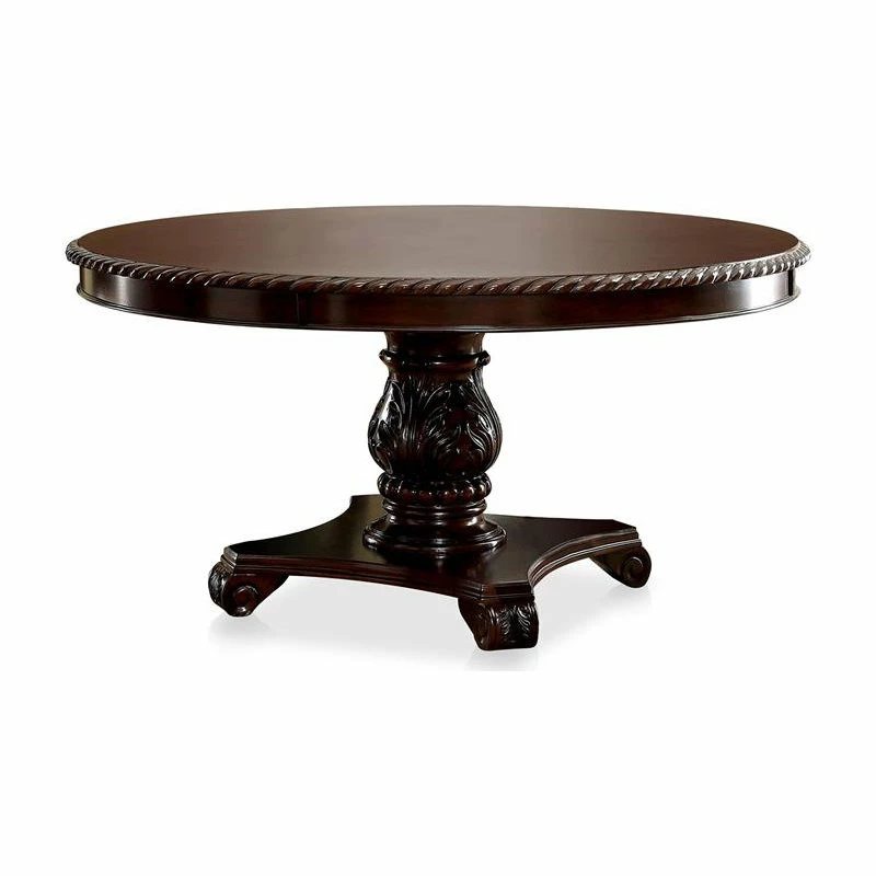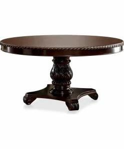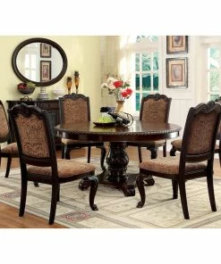 The centerpiece of this traditional five-piece Dining Table set is the beautiful pedestal table, which is adorned with intricate designs on its base and apron. Ornate side chairs feature beautiful, rich upholstery, Wood with sumptuous padding, and the set is finished in brown cherry.