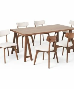 Add a rich look to your dining area with a set of eye-catching charm. Our dining set is a unique and functional way to add something fresh to your dining experience with its upholstered chairs, sleek wood-like finish, and a stunning A-frame table that gives you everything you have been looking for in your dining area. Complete with seating for six people and plenty of table space, you will find conversations with your guests effortless and enjoyable and your meals warm and hearty.