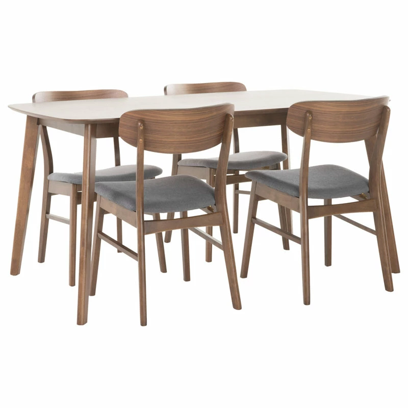 With matching wood finishes, you can’t go wrong with this dining set. Including one table and four chairs, this set is ideal for any home. The mid-century style and smooth wood finishes of this set will compliment any décor, so you don’t have to worry about clashing color pallets in your home. The dining chairs feature a sturdy design with soft fabric cushioned seats, providing both comfort and style for your dining pleasure.