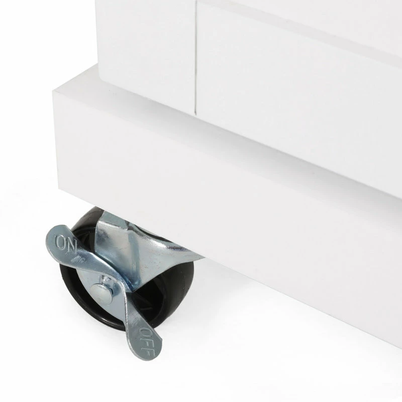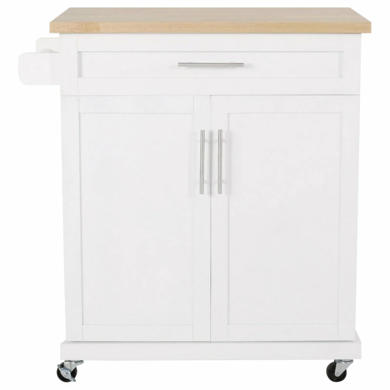 MULTI-FUNCTIONAL: Our kitchen cart offers one long drawer and two-door cabinet space for storing your items. This cart is also finished with a towel holder on one side. The bottom of the cart is completed by rolling casters with locks that make it effortless to transport.