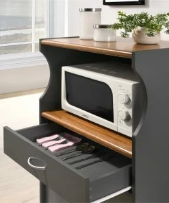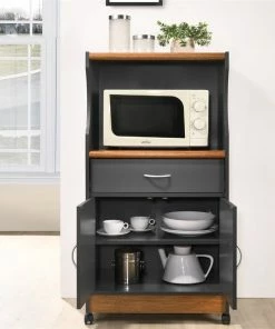 Contemporary and functional, this Hodedah Microwave Cart is the perfect solution for your kitchen storage needs. The open shelf space at the center houses your microwave and top shelf can be used to store your toaster oven. It has an enclosed cabinet space which provides compact kitchen storage for small kitchen appliances, pots and pans. It features a drawer for utensil, kitchen towels and any handy kitchen gadgets. Our microwave cart sits on wheels which allows for easy mobility if necessary. It is made of manufactured wood, which ensures strength and durability for many years to come in a beautiful and chic Gray-Oak color. Perfect as a coffee station at home, office or dorm room!