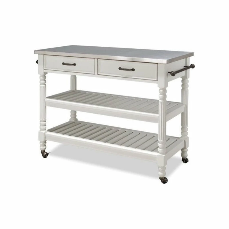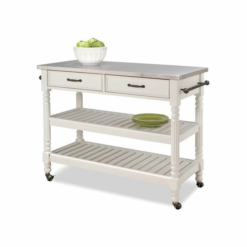Turn your kitchen into the most functional room of the house with this Homestyles General Line Kitchen Cart. Easily roll the prep space wherever it’s needed, and bring extra storage and convenience with it. The Off White finish matches any surrounding dΓ©cor and the drawers and shelves keeps the space tidy. With solid construction, a timeless stainless steel top, and a durable clear coat, it is easy to clean and maintain.
