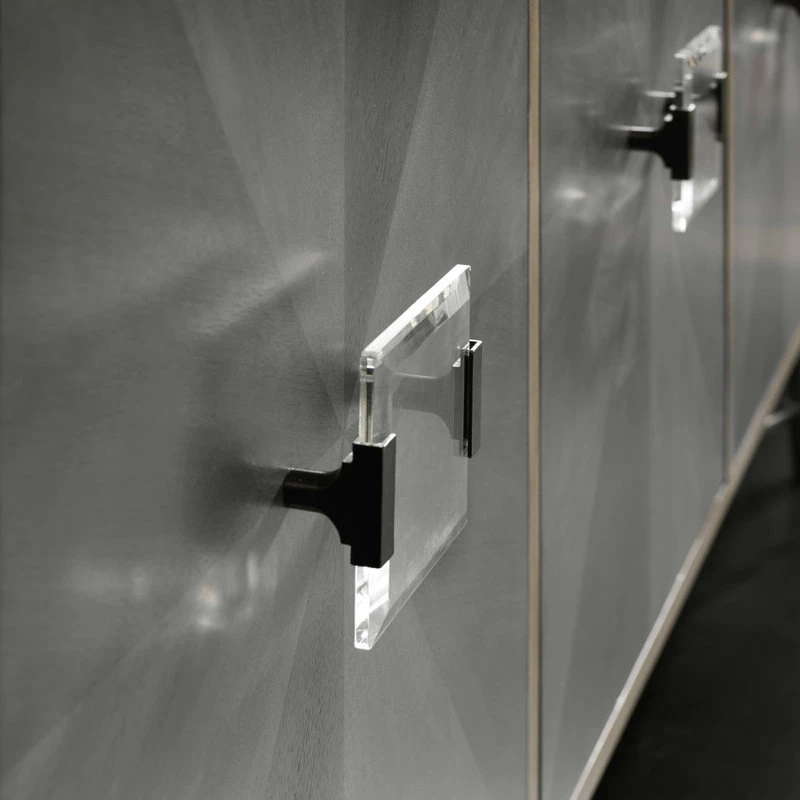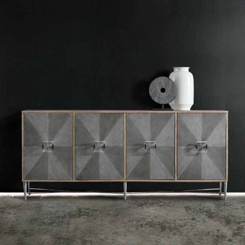 With its cosmopolitan flair and exquisite style, the Zola would be at home in a shop on Rodeo Drive – or in your living space. Crafted of Elm, Maple and Black Walnut, the case is finished in a natural color, while the front features a diamond pattern in contrasting gray tones, accented by jewelry-like Lucite pulls. A refined metal base in a silver finish creates the finishing touch. Four doors with soft-closing hinges, with one adjustable shelf behind both the center set of doors and the left and right doors.