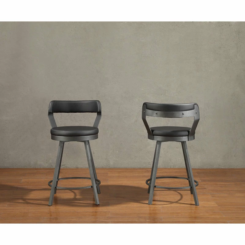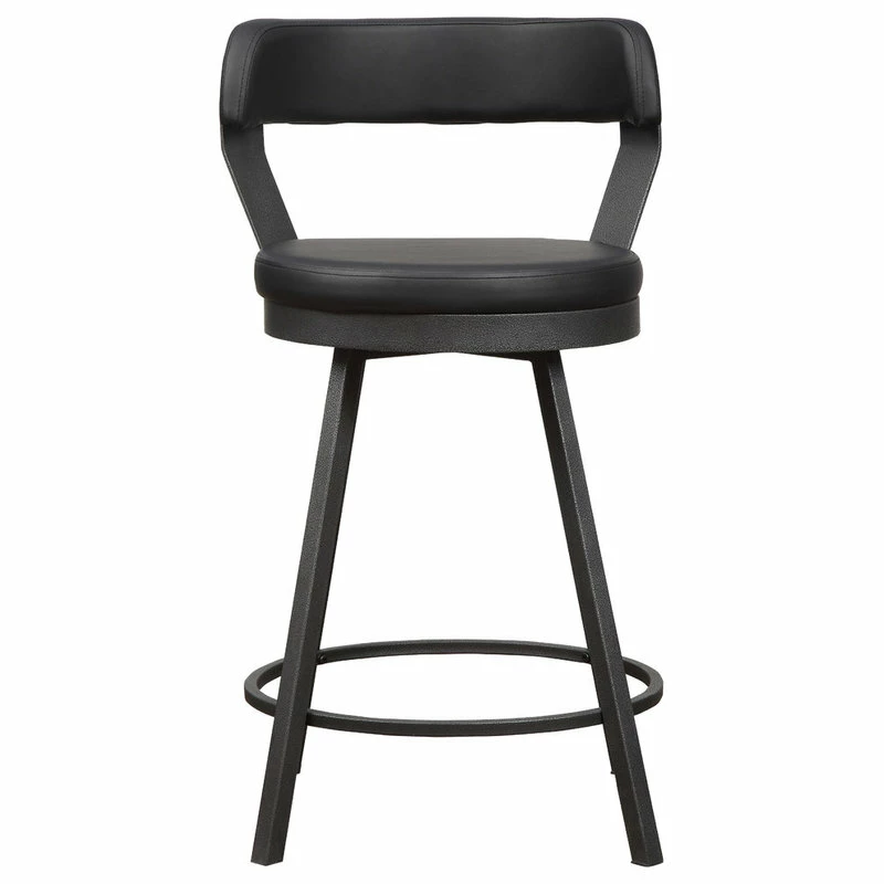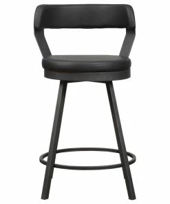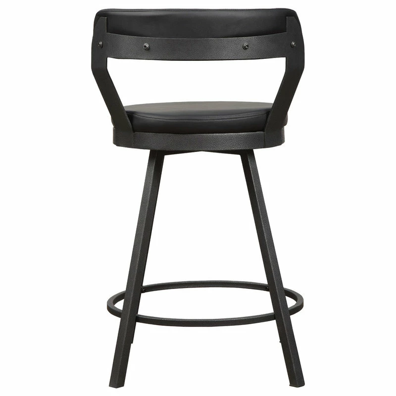 Perfectly styled for your casual dining room is the Sonya Collection. This counter height offering features a dark gray metal base, with built in wine rack, that serves to support the wood top which frames a black rectangular glass insert. The round seats and back supports of the accompanying chairs are covered in black bi-cast vinyl.