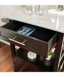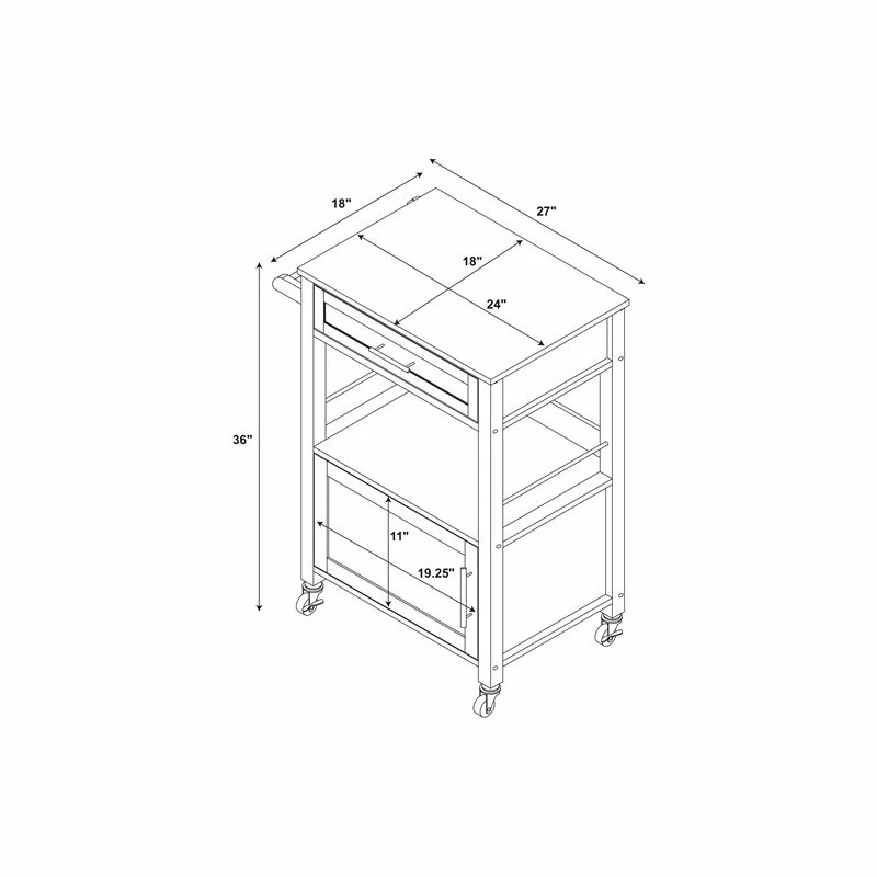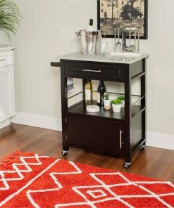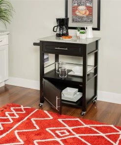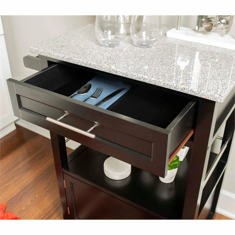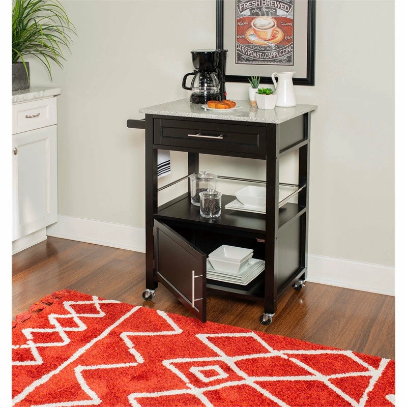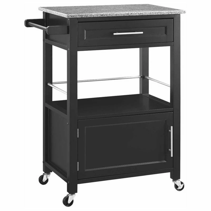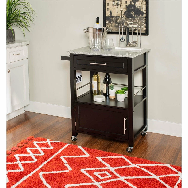 Need more counter space and storage? This versatile kitchen cart is your answer! With clean, modern lines, an elegant granite top, a classic black finish and silver hardware, it blends effortlessly into any decor. From the side towel bar and top drawer to an enclosed cabinet and shelf with metal railing, you’ll find storage to spare. The food safe, easy to maintain top can accommodate a coffee maker or compact microwave. Durable, locking casters glide easily, allowing you to prepare food and serve drinks anywhere.