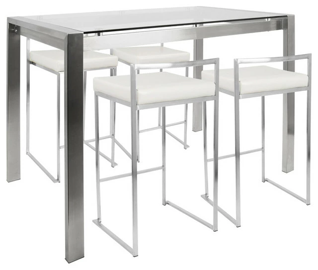 The Fuji Counter Set is perfect for any eating area. The simplistic lines of the Fuji Counter Stools and the sturdy metal build of the Fuji Counter Table, this set will add that modern touch to your home. This set includes four Fuji Counter Stools and one Fuji Counter Table.Features