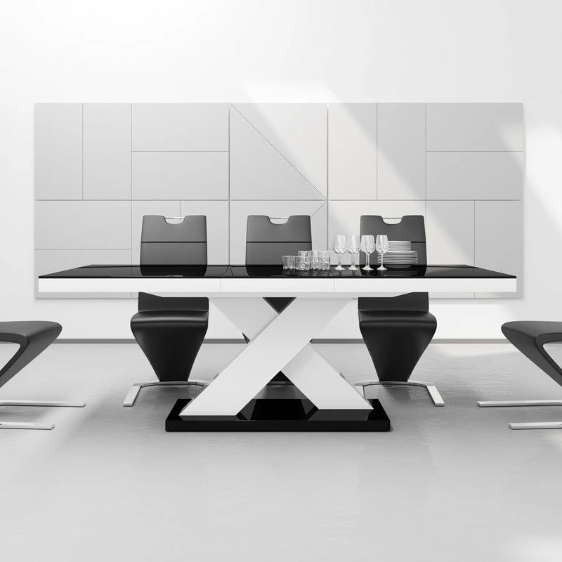 XENA Dining Set is an elegant dining table with 6 chairs for modern interiors that will make your dining room look representative. The original base of a table in the form of a cross is a stable and functional support that will allow you to comfortably sit at the table. Easily extend the table and adjust the size of the countertop to your current needs. The set will let you organize a party – invite a family or a larger circle of friends.