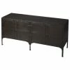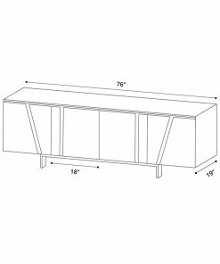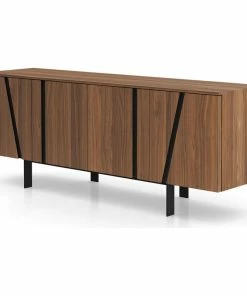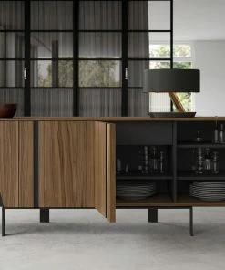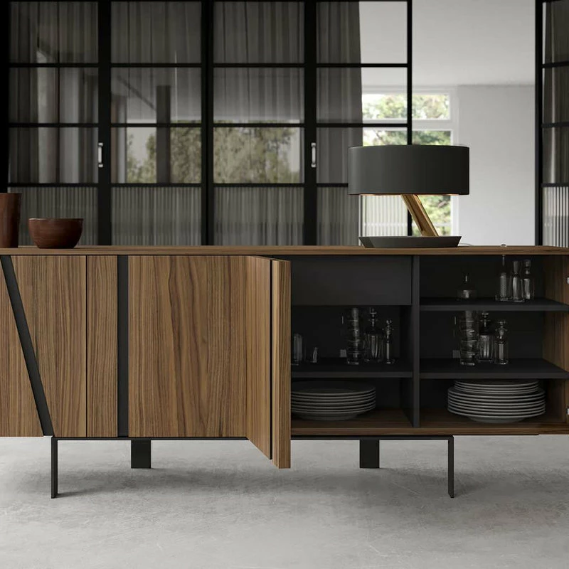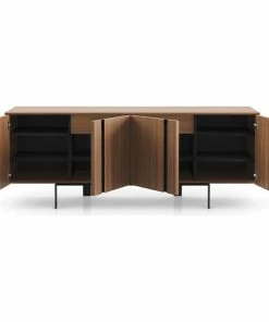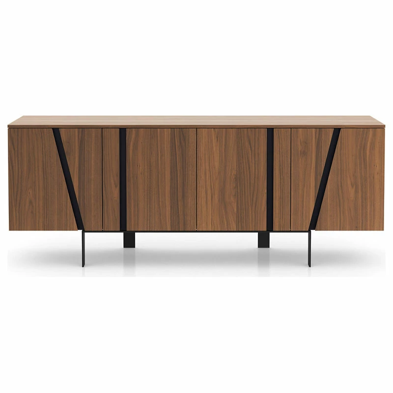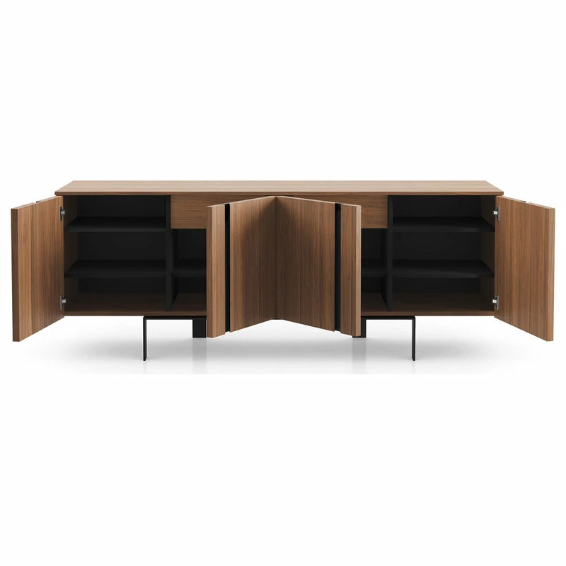 Angled cut-outs accent the wood grain of the Mott Sideboard’s body, also serving as hidden handles for easily opening the buffet’s two sets of double doors. Inside, a total of ten shelves and two smooth-gliding drawers offer plenty of storage space for your flatware and other dining room needs. The low-profile sideboard sits on a black powder coated base with feet splayed in rotating directions for a quintessential contemporary look. Contrasting interior colors present a cool modern appearance.