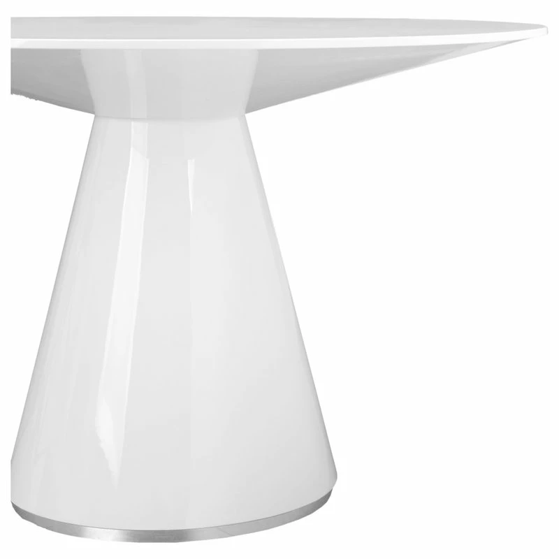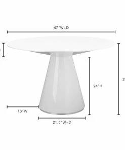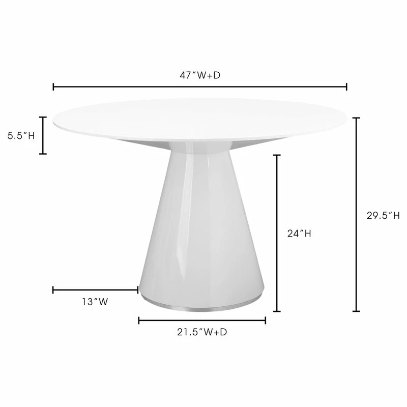 Nestled on top of a high-gloss lacquer pedestal, the Otago Table features clean lines and a contemporary modern style that is sure to brighten up your dining area with its glossy white tabletop and circular design. Brushed stainless steel detailing complete this tables seamless design.Wipe clean with damp cloth, wipe dry with clean cloth.Made in ChinaContemporary Modern. Color: White We offer 1 Year warranty. Dimension:47W 47D 29H. Product Weight:117.00 lbs. Material: High-Gloss LacquerMDFStainless SteelWe understand how important your home is and how decorating your kitchen, dining room or bedrooms with classy, contemporary furnishings can help make it a place that reflects who you are. We believe in the power modern furniture has in creating not just a home but YOUR home. We believe in feeling good about our home’s environment, and we think you do too.