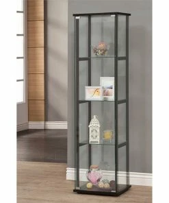 Ideal for a more compact space, this curio cabinet offers fresh and inspiring style. Simple linear design blends a slender black frame with tempered glass shelving. Push-to-open glass doors offer easy access to its interior space. This curio cabinet is an ideal venue for showcasing treasured decor and artwork. Add it to a tasteful seating ensemble or position it as an eye-catching standalone piece.