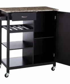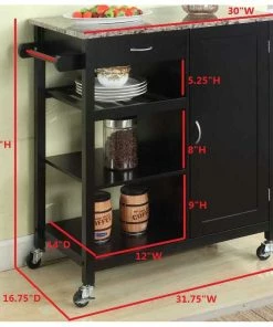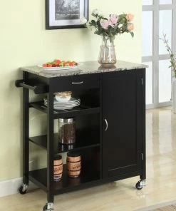 Black or White Finish Wood & Marble Finish Top Kitchen Storage Cabinet Cart. This serving cart will serve your needs at all time. This can be used for serving at meals, or as another piece of storage furniture for your everyday kitchen needs. With its 3 shelves, a cabinet and a drawer, it’s a great space saver, and serving tool. In addition the wheel base helps for swift and easy maneuvering.