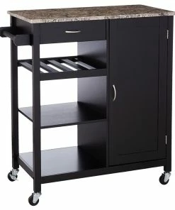 Black or White Finish Wood & Marble Finish Top Kitchen Storage Cabinet Cart. This serving cart will serve your needs at all time. This can be used for serving at meals, or as another piece of storage furniture for your everyday kitchen needs. With its 3 shelves, a cabinet and a drawer, it’s a great space saver, and serving tool. In addition the wheel base helps for swift and easy maneuvering.