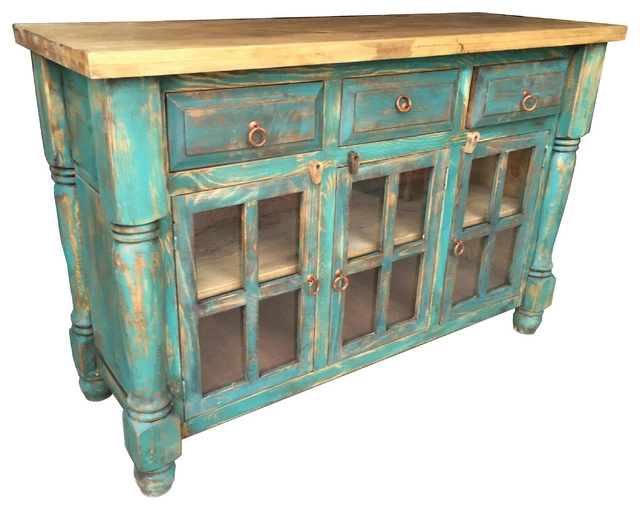 This beautiful Rustic buffet is hand crafted with kiln-dried solid wood, double doweled at joints. Two tone color with sealer and lacquer smooth finish, three glass doors with a shelf inside and three drawers for extra storage.
