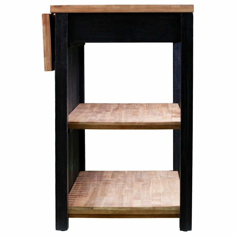 Whip up easy small space meal magic with this expandable kitchen island. Freestanding silhouette works as a prep station, hallway console, or dry bar in the game room, and the two-tone finish blends well without blending in. Solid acacia supplies sturdy construction, while two drawers and two shelves supply ample storage for everything you need, from pots and pans in the kitchen to accessories in the entryway. Naturalize your look with this multifunctional console serving up sleek, stylish function where you need it most. Black and natural finish. Solid wood kitchen island w/ drop-leaf countertop. Features a spacious expandable worktop, 2 drawers, and 2 shelves. Two-tone composition and slatted back. Multifunctional design doubles as a stationary dry bar or entry console. Dust with a soft, dry cloth. Top is not butcher block certified; use a cutting board for food prep. Quickly clean spills.