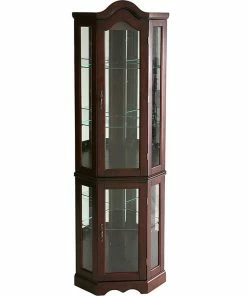 Display your collectables with pride in this lighted curio cabinet. Mirrors are present on both back edges to enhance the lighting of your items and give more visual depth. The golden oak finish complements the simple straightforward design with tall vertical panes and decorative arch top. Two adjustable shelves are present in the upper cabinet that can be raised, lowered, or removed to suite your needs. Additionally, the lower cabinet also contains one adjustable shelf. This lighted corner curio is sure to become a cherished piece of furniture in your home.