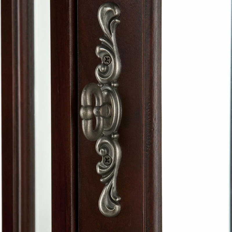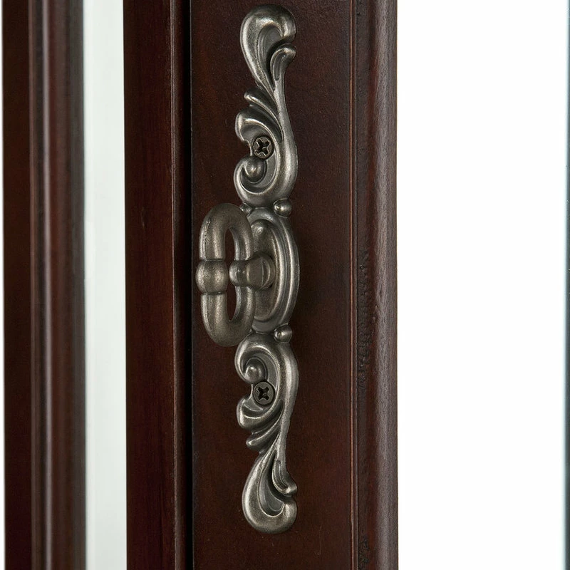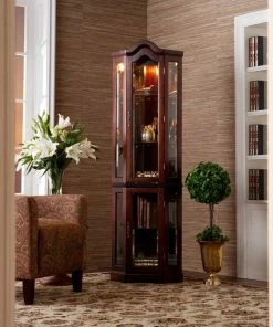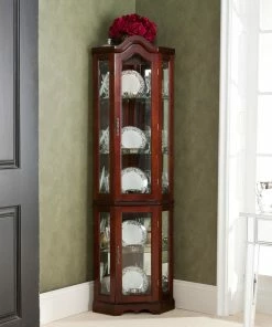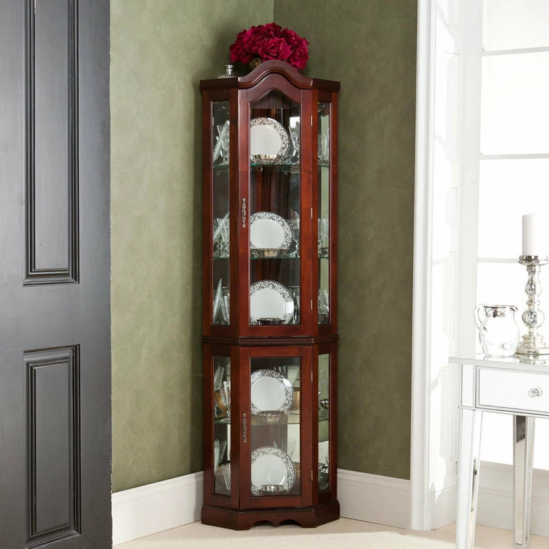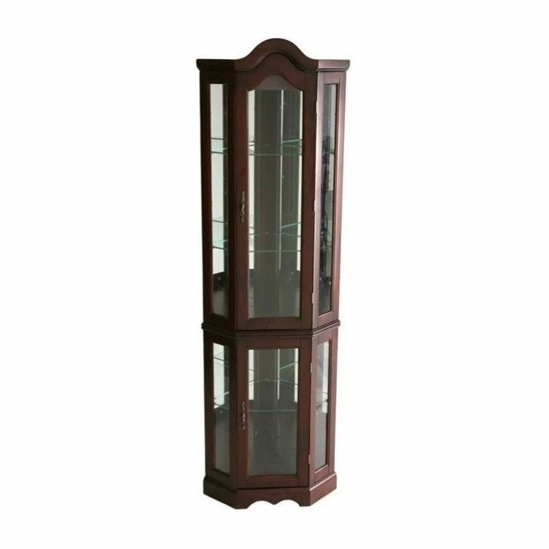 Display your collectables with pride in this lighted curio cabinet. Mirrors are present on both back edges to enhance the lighting of your items and give more visual depth. The rich mahogany finish complements the simple straightforward design with tall vertical panes and decorative arch top. Two adjustable shelves are present in the upper cabinet that can be raised, lowered, or removed to suite your needs. Additionally, the lower cabinet also contains one adjustable shelf. This lighted corner curio is sure to become a cherished piece of furniture in your home.