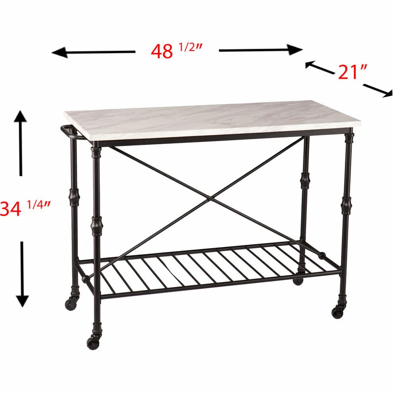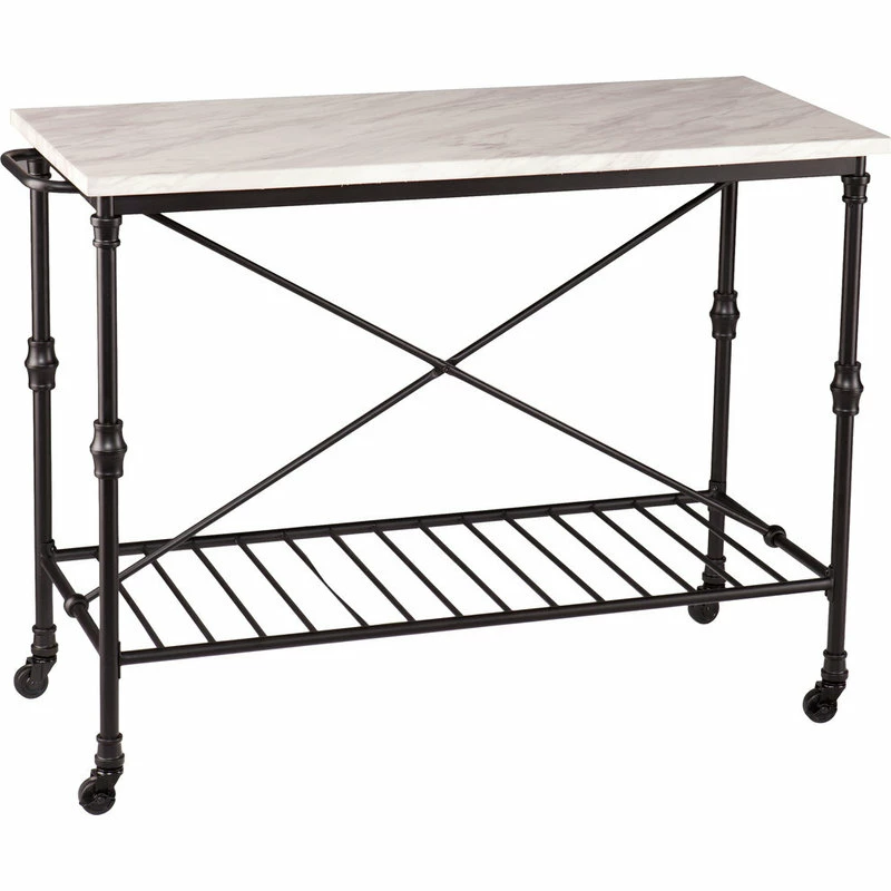 Simmer a reduction in kitchen clutter with this country chic, easy rolling galley island. Authentically textured, warm gray marble-look countertop sleekly shines atop matte black, scrollwork inspired cart. Sweeping slatted shelf hosts everything from pots and pans to cookie sheets while the open X-frame creates a center divide for additional organization. Your small space kitchen can have its cake and eat it too, just employ this refined industrial island permanently as a go-to coffee bar or slide around your kitchen for a mobile prep station. Variations in faux marble texture should be expected, giving each piece a unique look. Faux marble surface is not knife safe, spills should be cleaned immediately to protect finish.