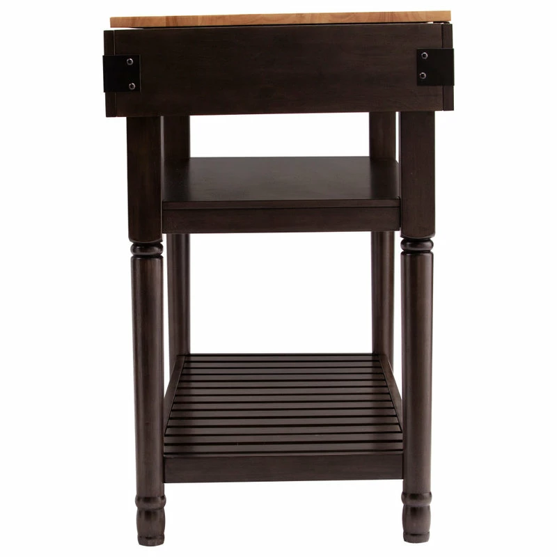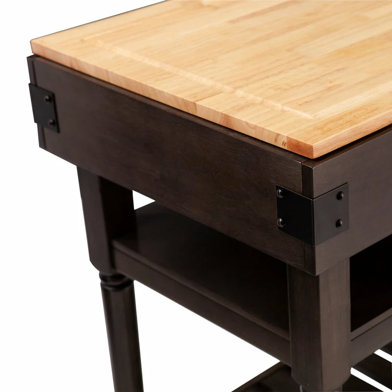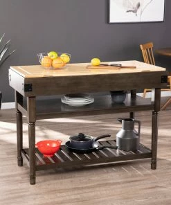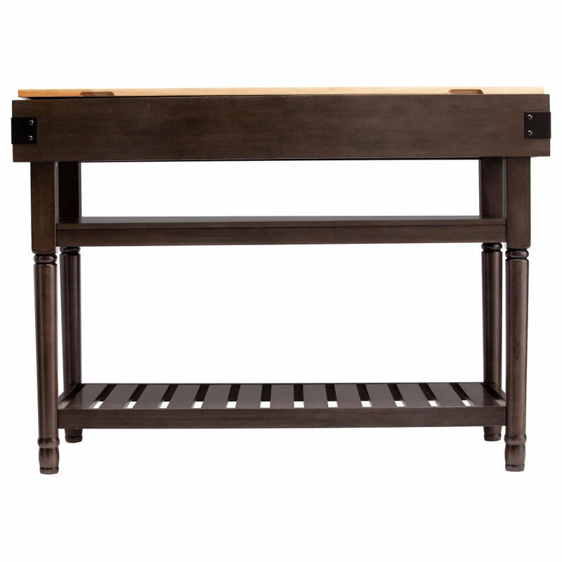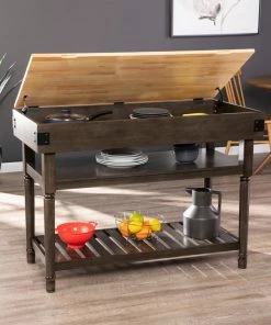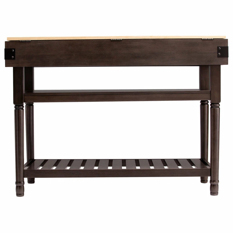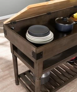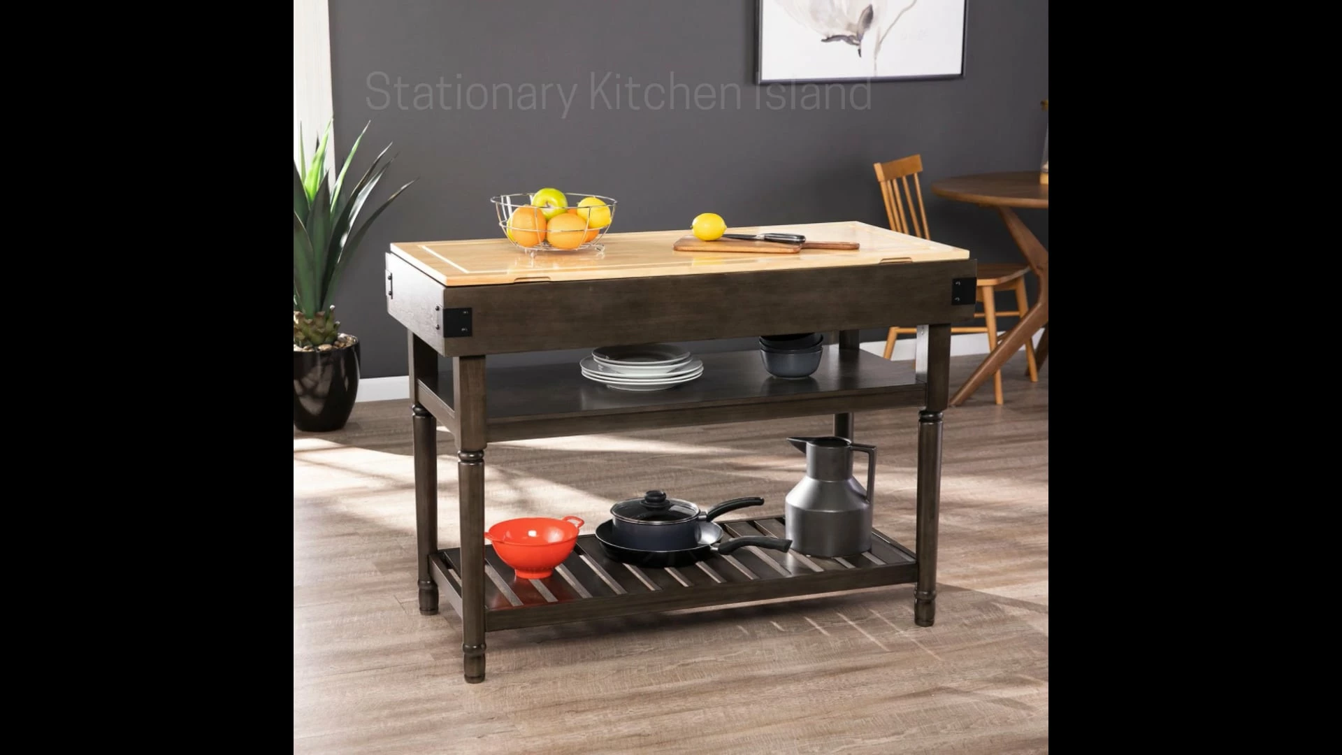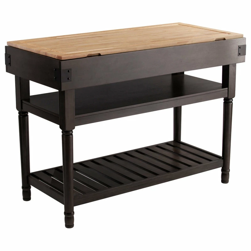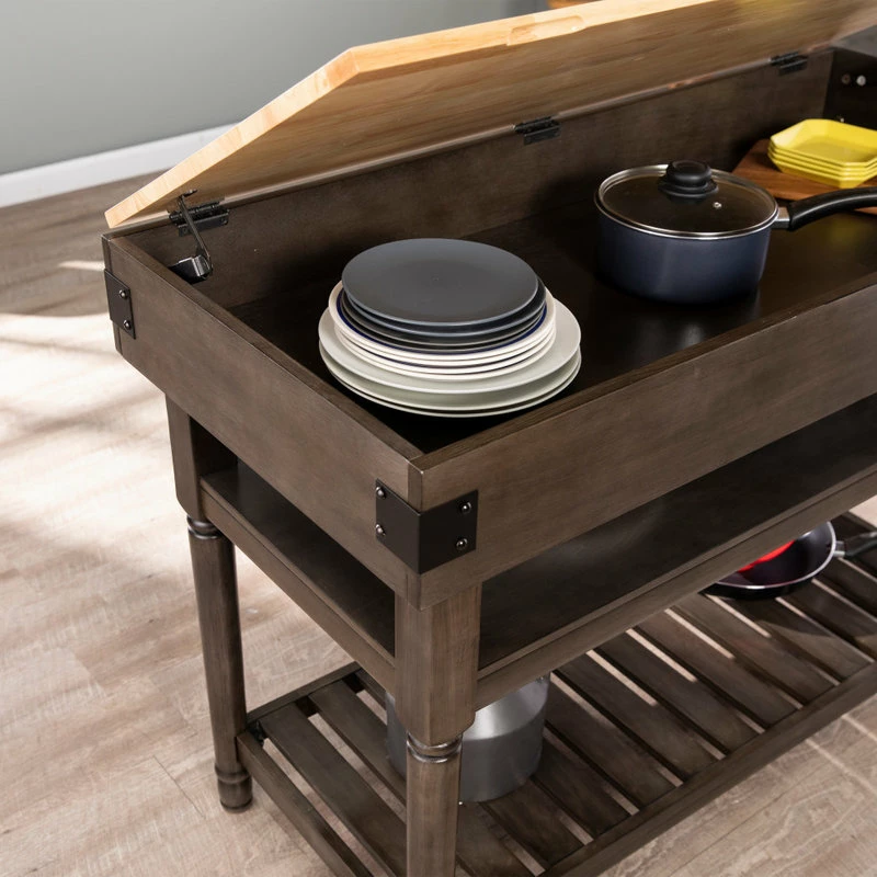 Cook up a cure for clutter with this stationary kitchen island. Lifting butcher block top tidies away utensils and placemats while open shelving supplies storage space for serving trays and pots and pans. Simple silhouette and neutral finish keep the focus on function, pleasing even the most minimalist style palette. Add this medium-sized stationary island to your kitchen for extra prep space, or to your mudroom for a folding table worth talking about.