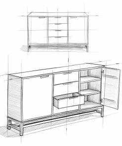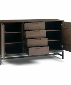 The Banting Collection is made from richly-grained solid Rubberwood stained in a deep walnut brown finish. This mid-century modern industrial collection has a clean angular metal base, with square, simple modern drawer and table top. With no visible hardware, and only simple wood pull handles, the solid Rubberwood top, is simple and uncomplex. The Banting 60 inch Sideboard Buffet has four working drawers with full extension ball bearing drawer glides and two doors opening to large storage space with two adjustable shelves each to maximize functionality. The Banting collection includes coffee, console, end tables, tv stands, sideboard buffet, desks and bookcase.
