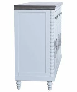 Built around a crown molding top and bobbin spool style corner posts, the Montauk cabinet is made using ash veneer and solids with a two tone finish. Crafted with metal ball bearing glides and concealed hinges for modern use, it features adjustable shelving behind its four cabinet doors. This striking piece is a centerpiece quality item perfect for living rooms, bedrooms, dining areas, and more.