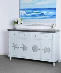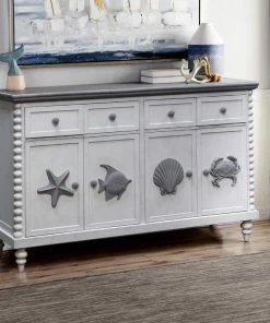 - Sea shell drawer pulls with decorative sea animal relief for each door front
