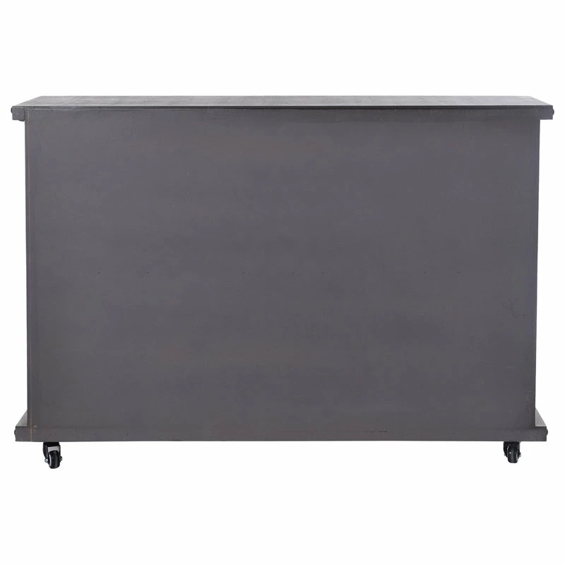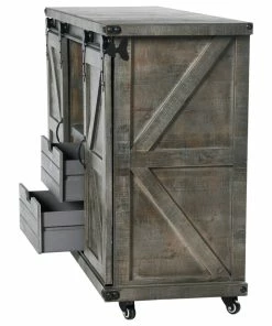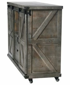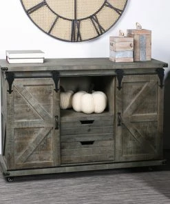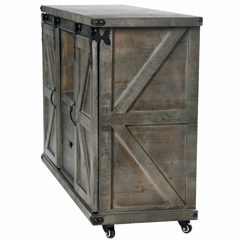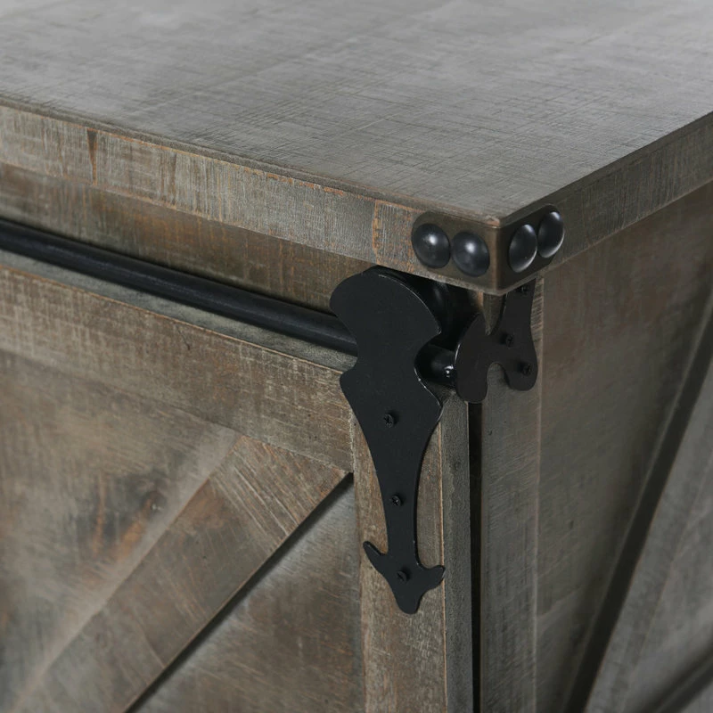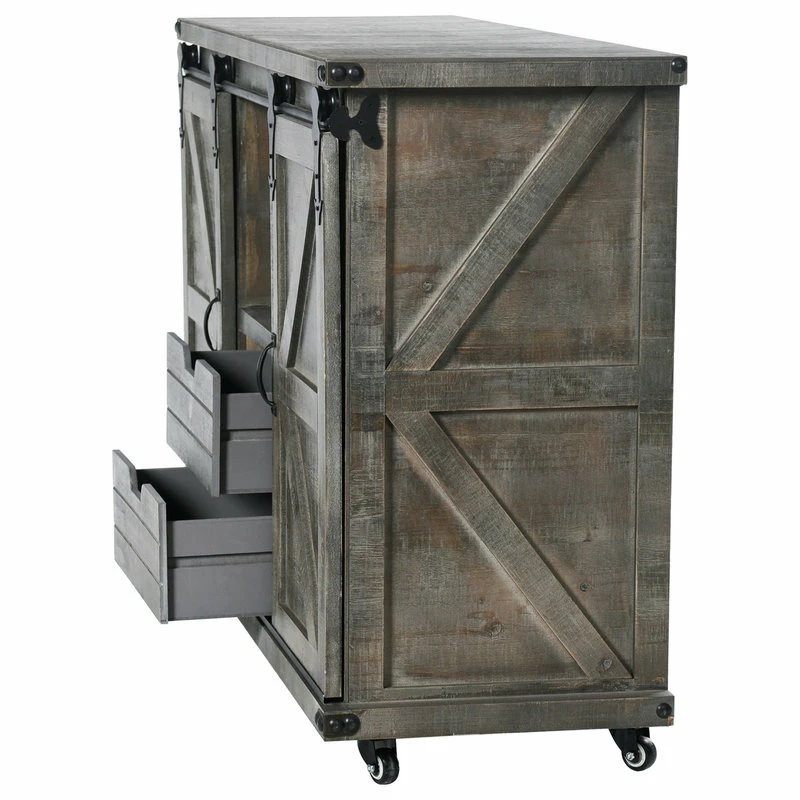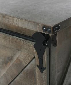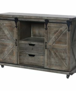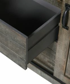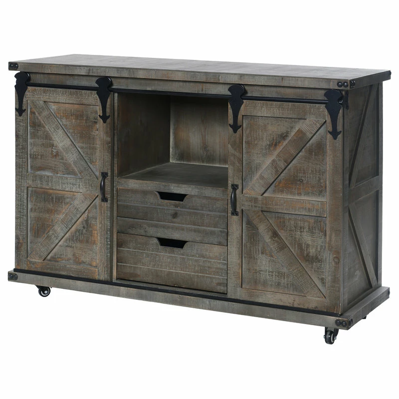 The Presley cabinet is a rustic style piece with a driftwood grey finish and black metal hardware. The cabinet has two barn-style rolling doors with slant board detailing on either side of the center section that features an open shelf and two drawers. This beautiful cabinet adds a unique look to your favorite room while providing ample storage space for media, books, or anything else you need to keep organized.