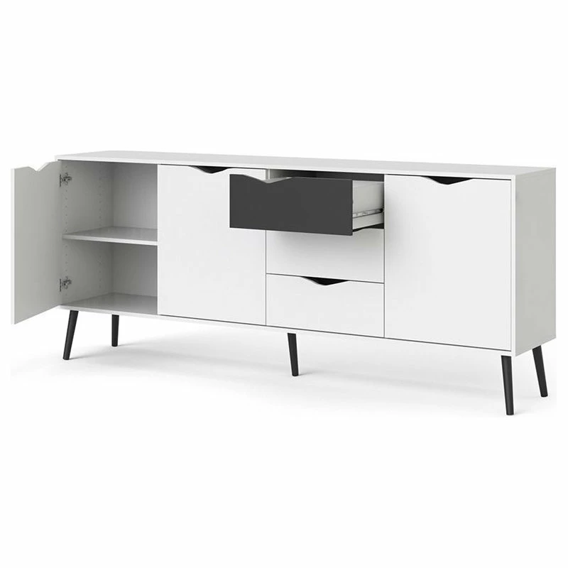 Give your living space an instant update with the Diana Sideboard with 3 Doors and 3 Drawers. It offers authentic Scandinavian design with clean lines and a modern two-tone finish. This sideboard is ideal for any living space that needs storage featuring three drawers and three doors with grooved cut out handles. The sideboard has ample room without being short on style with the light and airy color combination of a crisp white top with wood tapered, round legs perfects this fresh interpretation of mid century design. This Diana Sideboard with 3 Doors and 3 Drawers is also easy to wipe clean and resists scratching to keep it looking new longer. Complete your living space with other items from the Diana collection.