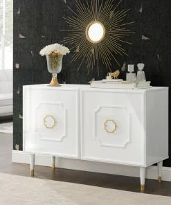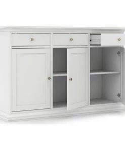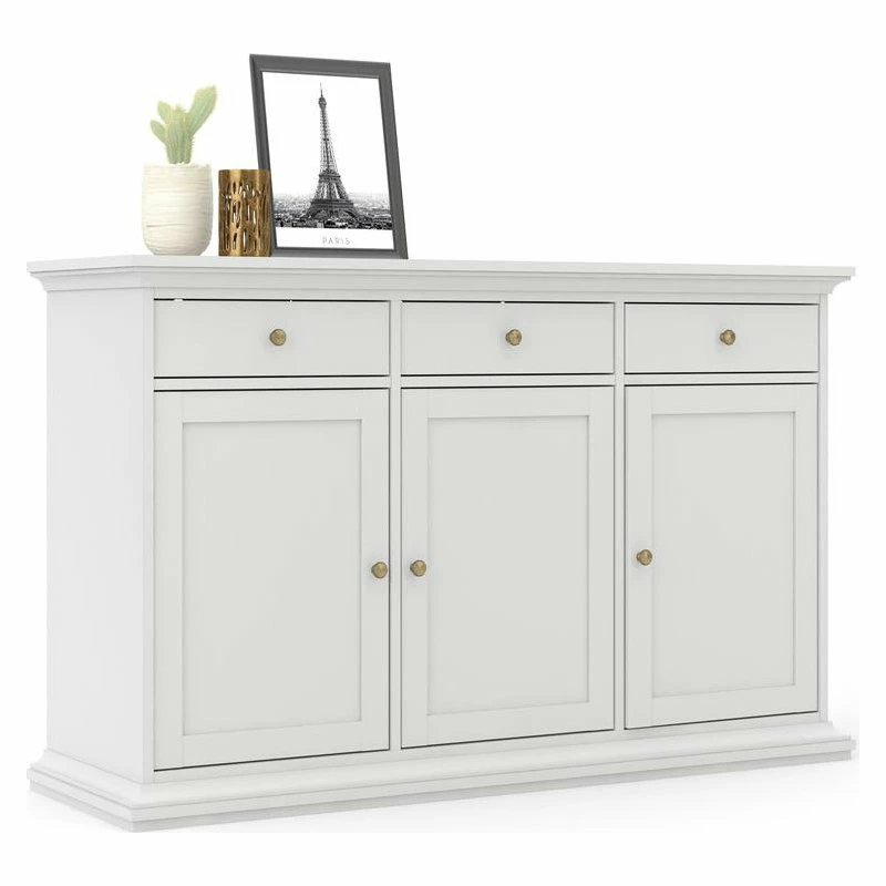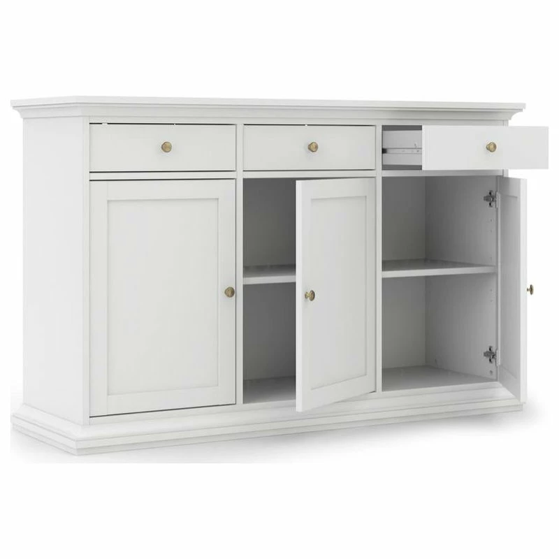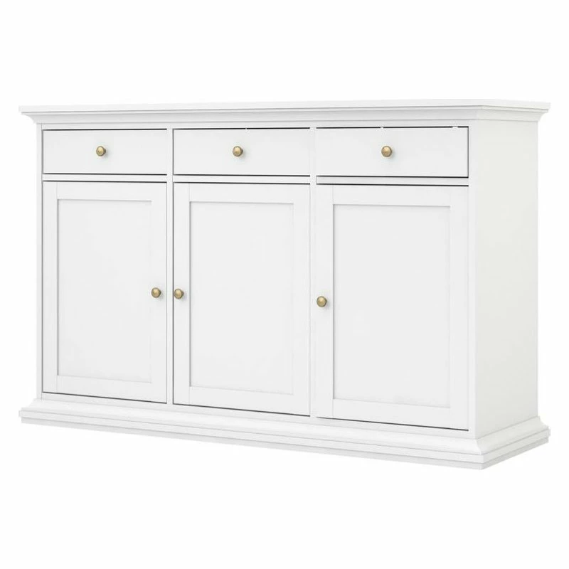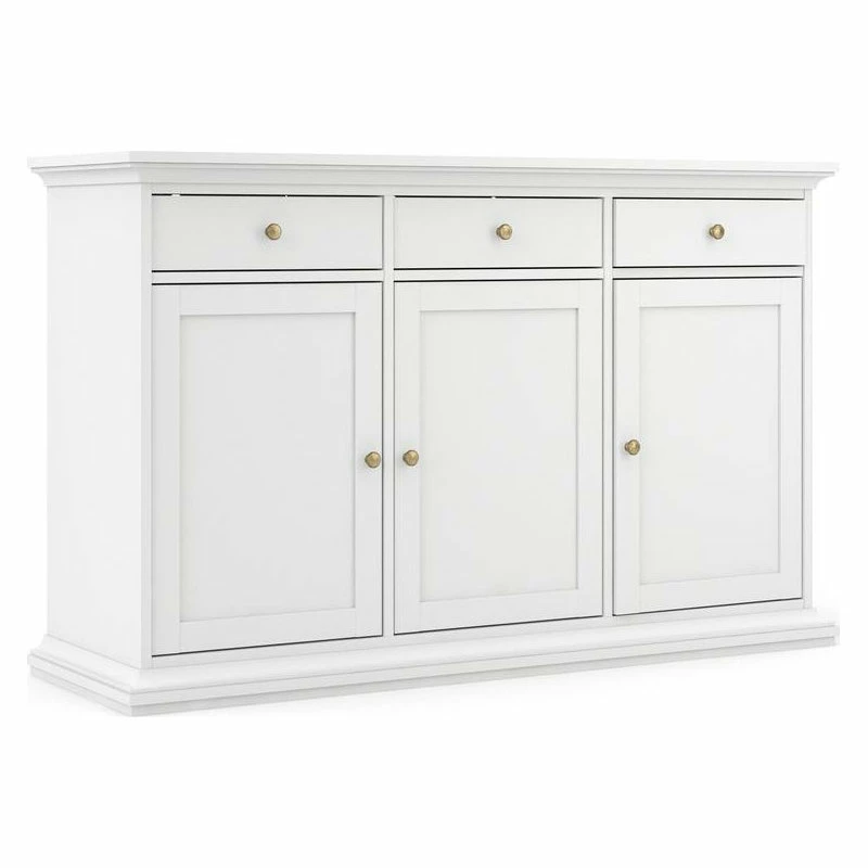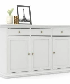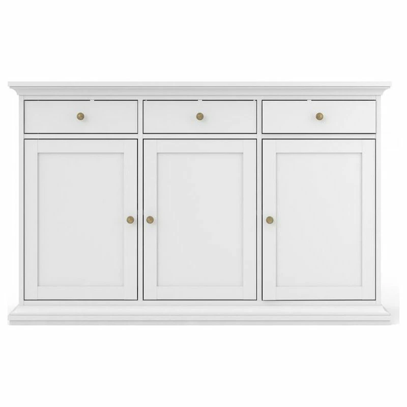 Accentuate your living room with the Sonoma white 3 drawer, 3 door sideboard. Complemented with top and bottom moldings, rounded metal knobs, and classic detailed finishes, this is a perfect conversational piece. The Sonoma sideboard is great for entertaining and additional storage.