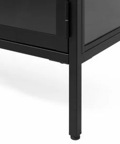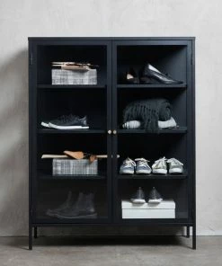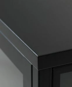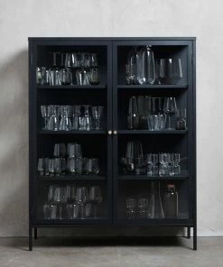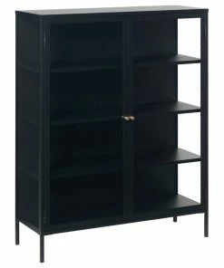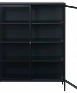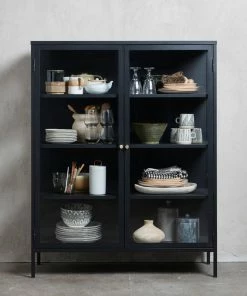 Enjoy a more refined take on the modern design aesthetic with this metal and glass display cabinet. This metal two door china cabinet is designed with two glass panel door fronts, four shelves and simple black metal framework, making it the perfect home for your favorite pottery, books and other collected curiosities. The design is timeless and complements any range, color or texture so feel free to mix it up with both natural wooden colors, darker smoked stains and bold colors from fabrics or simply use it as a “stand-alone” statement piece. The cabinet has five year commercial warranty.