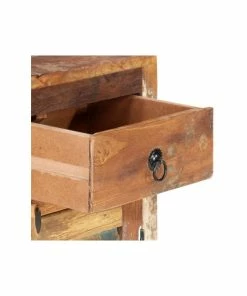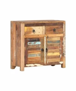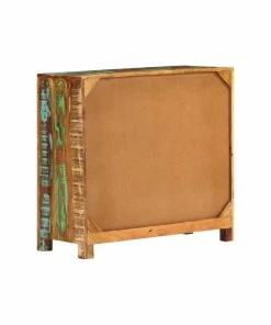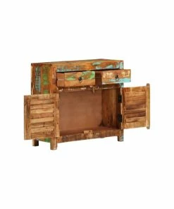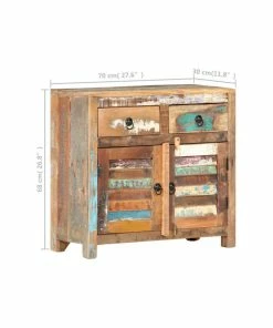 This sideboard will be a perfect choice if you are looking to add a touch of rustic charm to your home decor. This storage cabinet is handmade from solid reclaimed wood, a combination of reclaimed timbers including teak, mango wood, pinewood, beech, etc. These woods are recycled from old buildings such as factories, sheds and boats. This makes it a fantastic environmentally friendly option in furniture making. As every piece is handmade, colors vary with many blues, greens, creams and sometimes oranges, reds and pinks shades revealed. This even means each one is unique! The sturdy top is ideal for displaying photo frames, vases, fruit baskets, or other decorative items. Additionally, 2 drawers and 2 doors provide ample storage space, which will keep your items dust free and clutter out of sight. Important note: The color may vary from piece to piece, making each of our sideboards unique; the delivery is random.