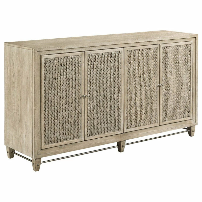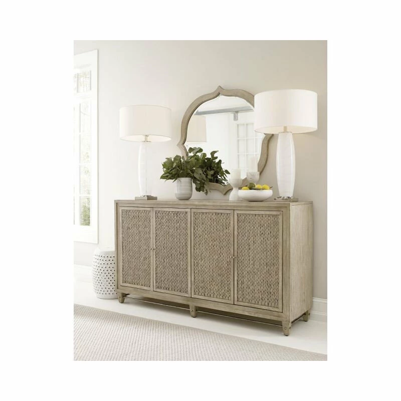 This Sterling Buffet features a white oak frame with a wood and seagrass combination across the door panels. The interior offers two felt-lined drawers, plenty of storage space, and adjustable shelving.